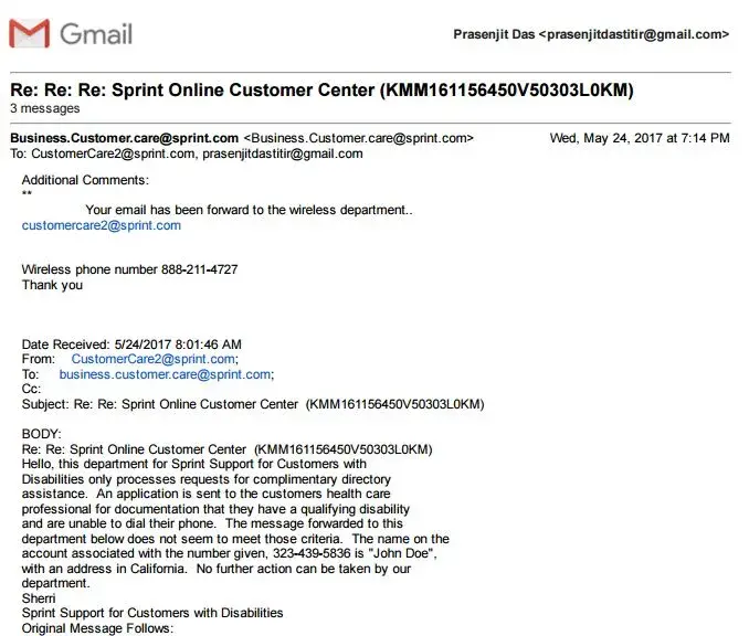 Then I again mailed to the customer service and they confirmed that this phone number is active in the name of "john doe", with an address in california. I am in a dilemma of what has happened until now.