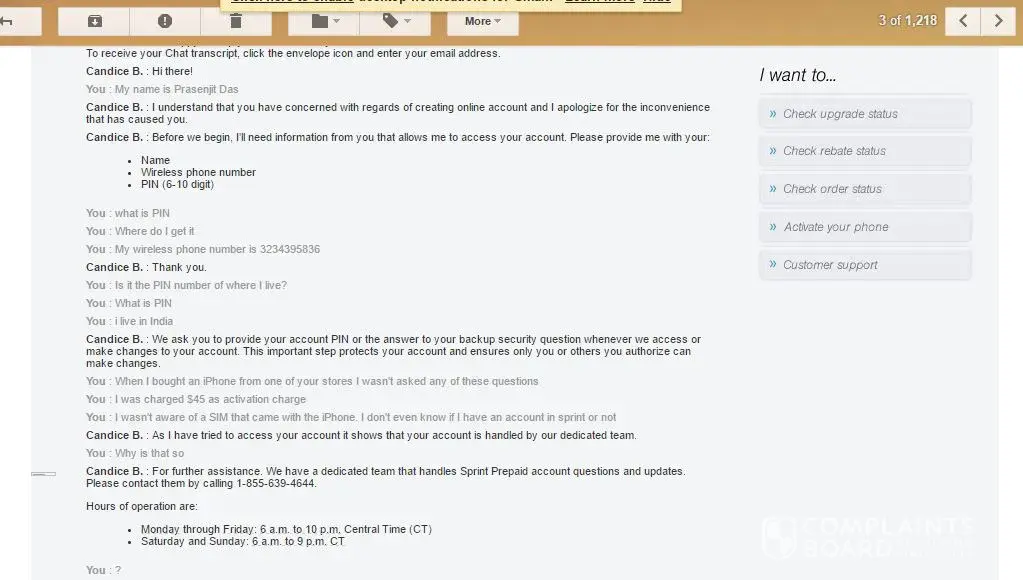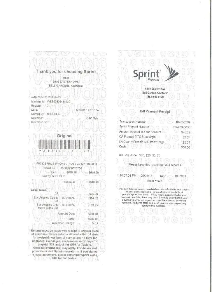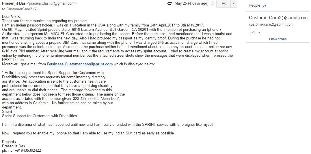 I am an indian passport holder. I was on a vacation in the usa along with my family from 24th april, 2017 to 9th may, 2017. On 8th may, I visited sprint prepaid store, 6919 eastern avenue, bell garden, ca 90201 with the intention of purchasing an iphone 7. At the store, salesperson mr. Miguel c assisted us in purchasing the iphone. Before the purchase I had mentioned that I was a tourist and that I was returning back to india the next day. Also I had provided my passport as my identity proof. During the purchase he had not mentioned anything about a prepaid sim card that came along with the phone. I was charged $45 as activation charge which I had presumed was the unlocking charge. After coming back to india I tried to use my phone and found that it was locked by sprint carrier.