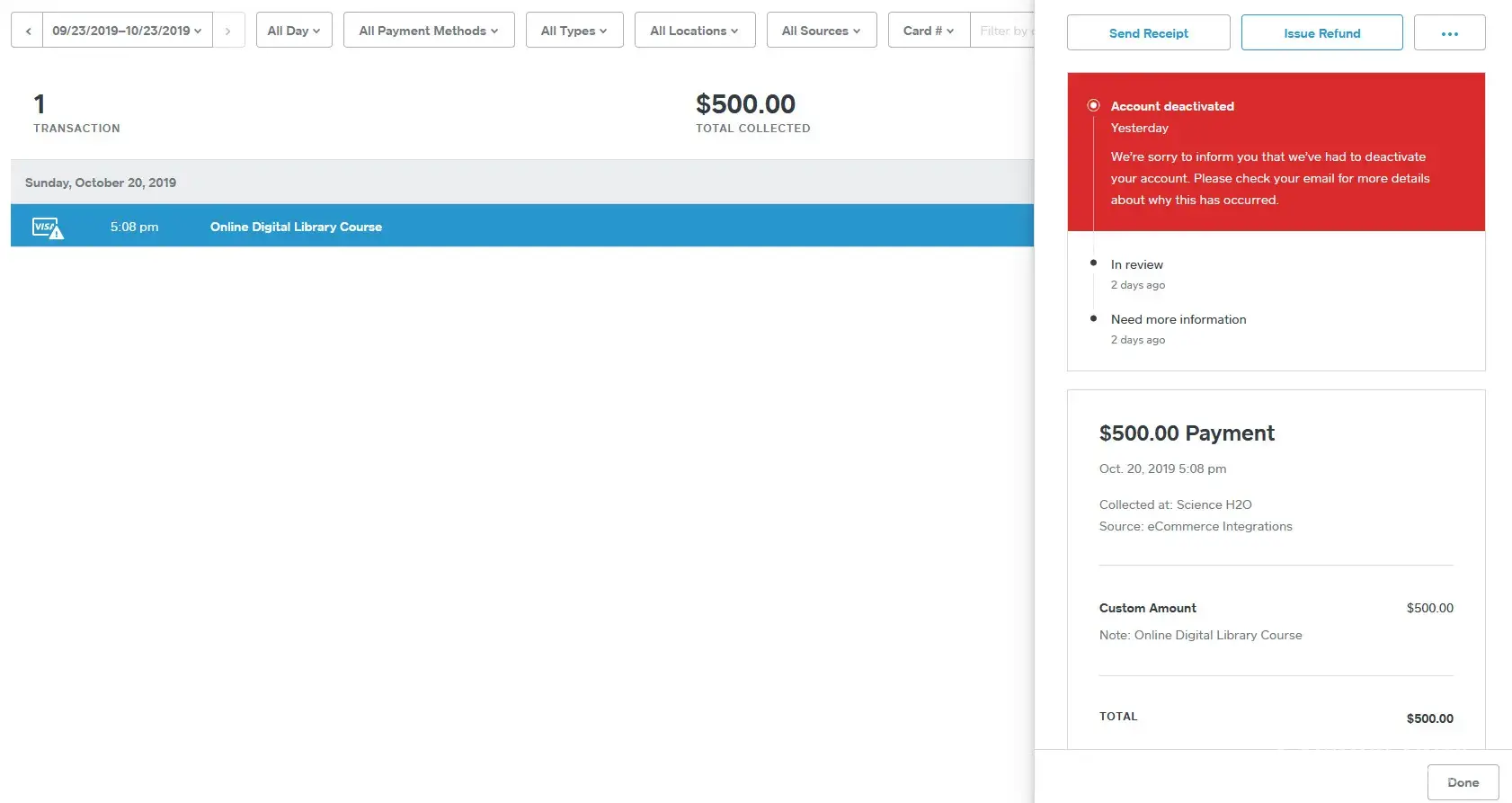 I had a square account for 6 years and did 1 transaction for 500.00 on 10/20/2019 which received a 1-2 business delay to review, I was asked to submit 10 different documents including GOV ID and also spoke with a Square representative Account deactivated Yesterday We're sorry to inform you that we've had to deactivate your account. Please check your email...