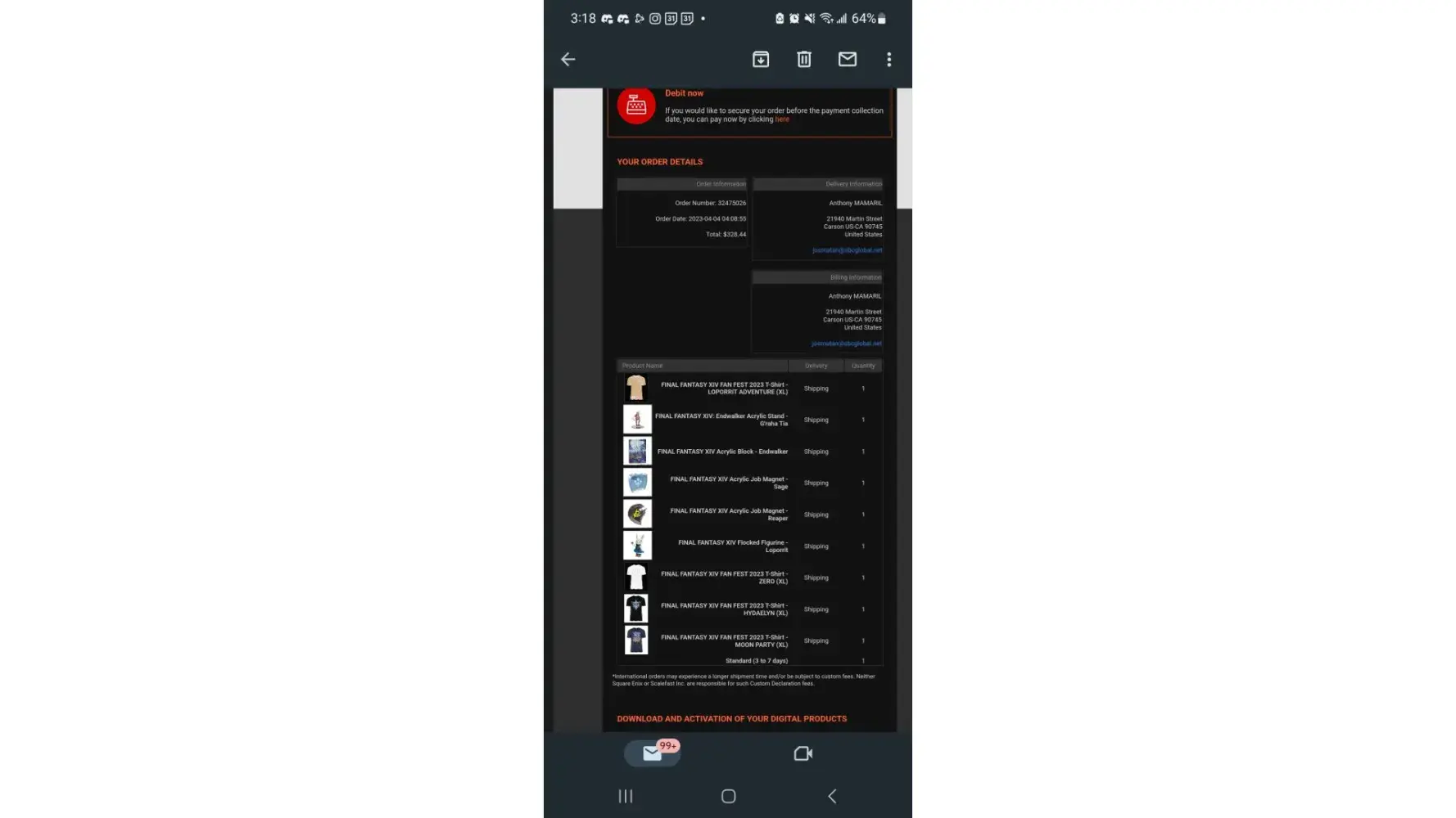 I also had a pre-order of 9 items from the Square Enix store for the Final Fantasy XIV Fan Fest, but had not charged any purchases yet. The total of the charge is $328.44, but I think the tax is not included yet. I had requested this pre-order on April 4, 2023. I wanted to charge this amount to my card to secure my order, but I found out any orders made before May 24, 2023 can not viewed on the Square Enix store. the order # for the Final Fantasy XIV Fan Fest merchandise: [protected]