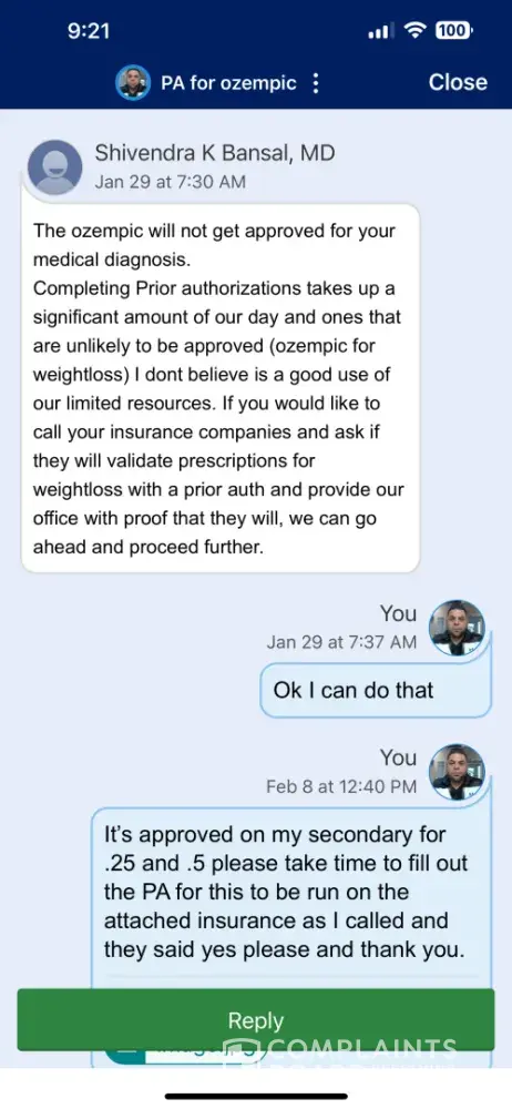 My husband was prescribed a medication for weight loss that required a prior authorization. Our pharmacy faxed the paperwork twice but Dr Bansal denied receipt, so the pharmacy staff hand delivered it. Dr. Bansals office then refused to request a prior authorization from the insurance company using the excuse that they will not pay for it anyway and it takes too much time. We called the insurance company and verified that they would in fact cover this medicine for my husband with the one page paper needed by the dr office stating why. My husband informed Dr. Bansal’s office but they then wanted him to provide proof in order to fill out the paperwork. I do not record phone calls. I am not sure why this has to be such a big deal for this doctor office when everyone else does it without hesitation, with a smile.