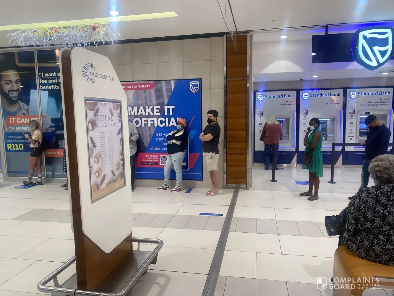 The 29th of December, queuing for more than an hour, queue running outside standardbank, Fish hoek branch closed down had to drive to Blue Route Mall!