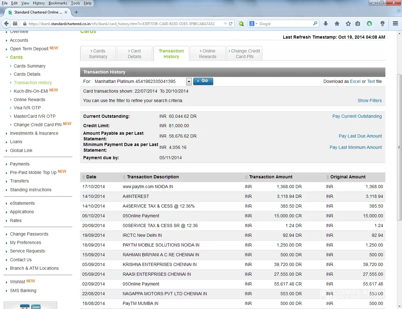 Please beware of Standard chartered credit card supplier department. I paise just 40 paise less, and after one year without being in touch or informed by Bank. Bank came up with huge amount with penalty + interest. SO I 40 paise has been now a huge huge amount. Great business by Bank. Please be careful!