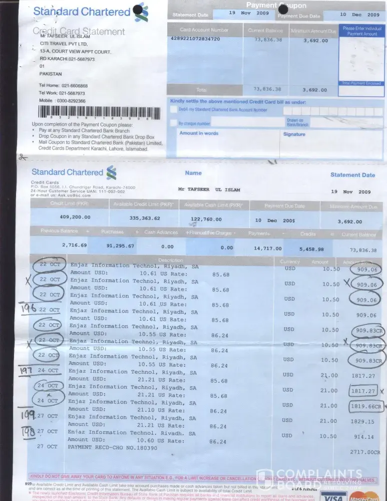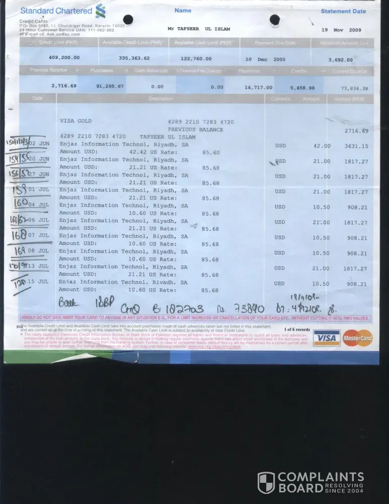 I would like to divert your kind attention towards the credit card transactions on my Card # [protected]. I got statements dated 19th Oct 2009 and 19th Nov 2009 amount Rs. 2716.69 & Rs. 73836.38 which I paid on 22nd Oct 2009 by cheque # B 180390 amount Rs 2717 and 4th Dec 2009 by cheque # B 182703 amount Rs. 73840/- (Statements enclosed) regarding different transactions in which Enjazit Information Technology, Riyadh Saudi Arabia USD $ 672 is discussable.