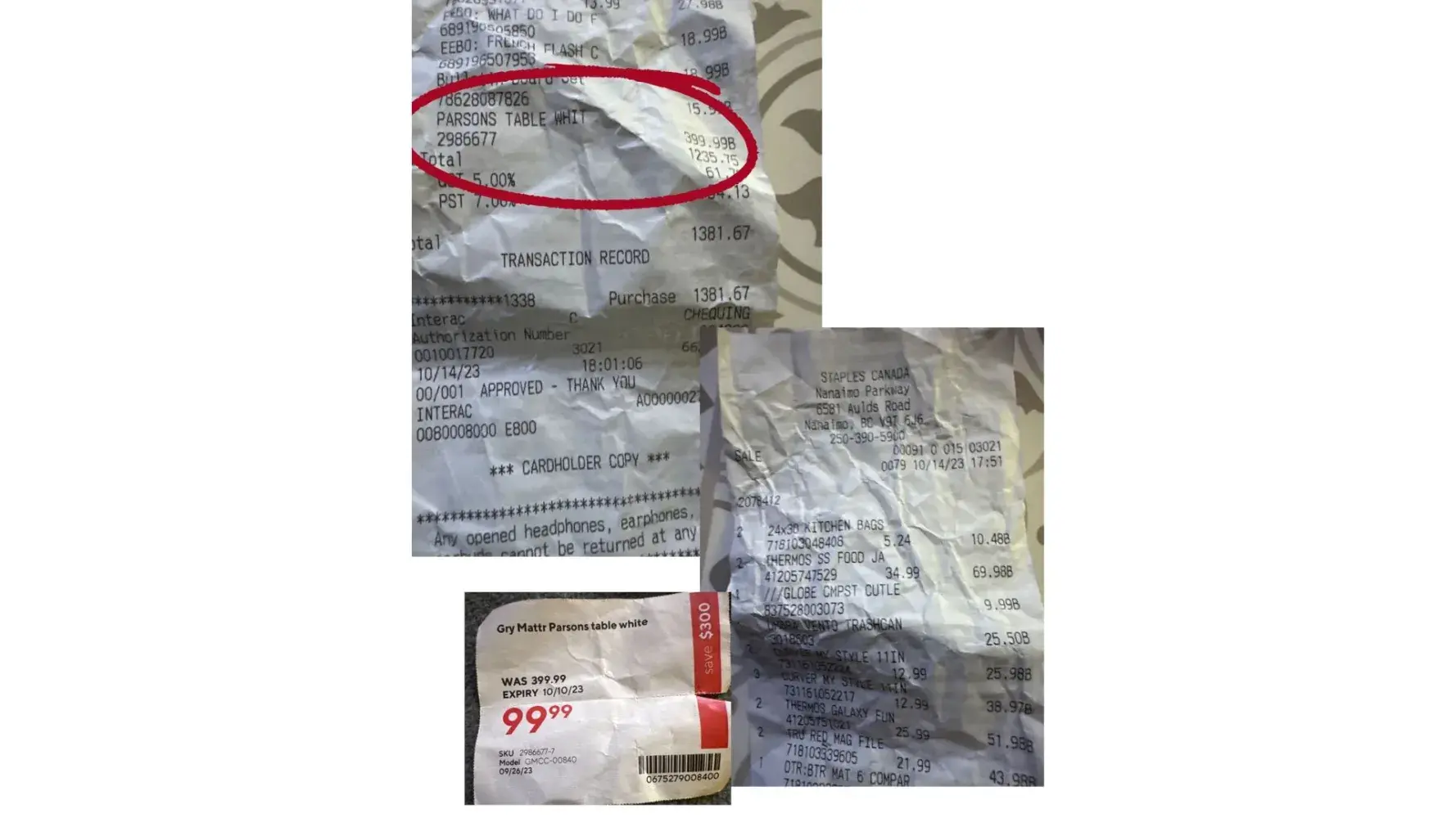 Read full complaintdiscrepancy regarding promised sale price at staples nanaimo sat. oct.14th gry mattr parsons table white