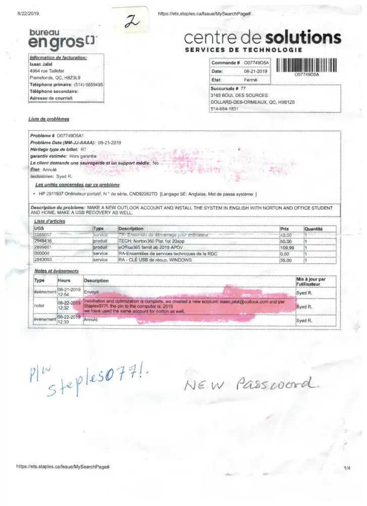 It involves Bureau En Gross Store #77 at Dorval Québec. I purchased a Laptop in 2019 with TWO YEARS warranty. I have had many problems with this laptop. I asked to replace it, they refused. They fixed the other malfunctioning but the problem with OFFICE 365 continued and they refused to fix it even though the product is still under the manufacturer's warranty. Due to Covid-19 the store was closed for a long time. This week, the store is re-opened. I called the manager and asked if I could bring the Laptop to fix Office 365 (he knew the problem since last year). "I am very busy and this soft ware is not under the warranty" the manger replied. I pointed out that the store installed wrong software and gave me the wrong Product Key. But he didn't want hear about it and said "I don't care". I called Staples Canada one January 18, 2021, A Rep. Named Mae told me she would look into it and call me back. I am still waiting for her call.