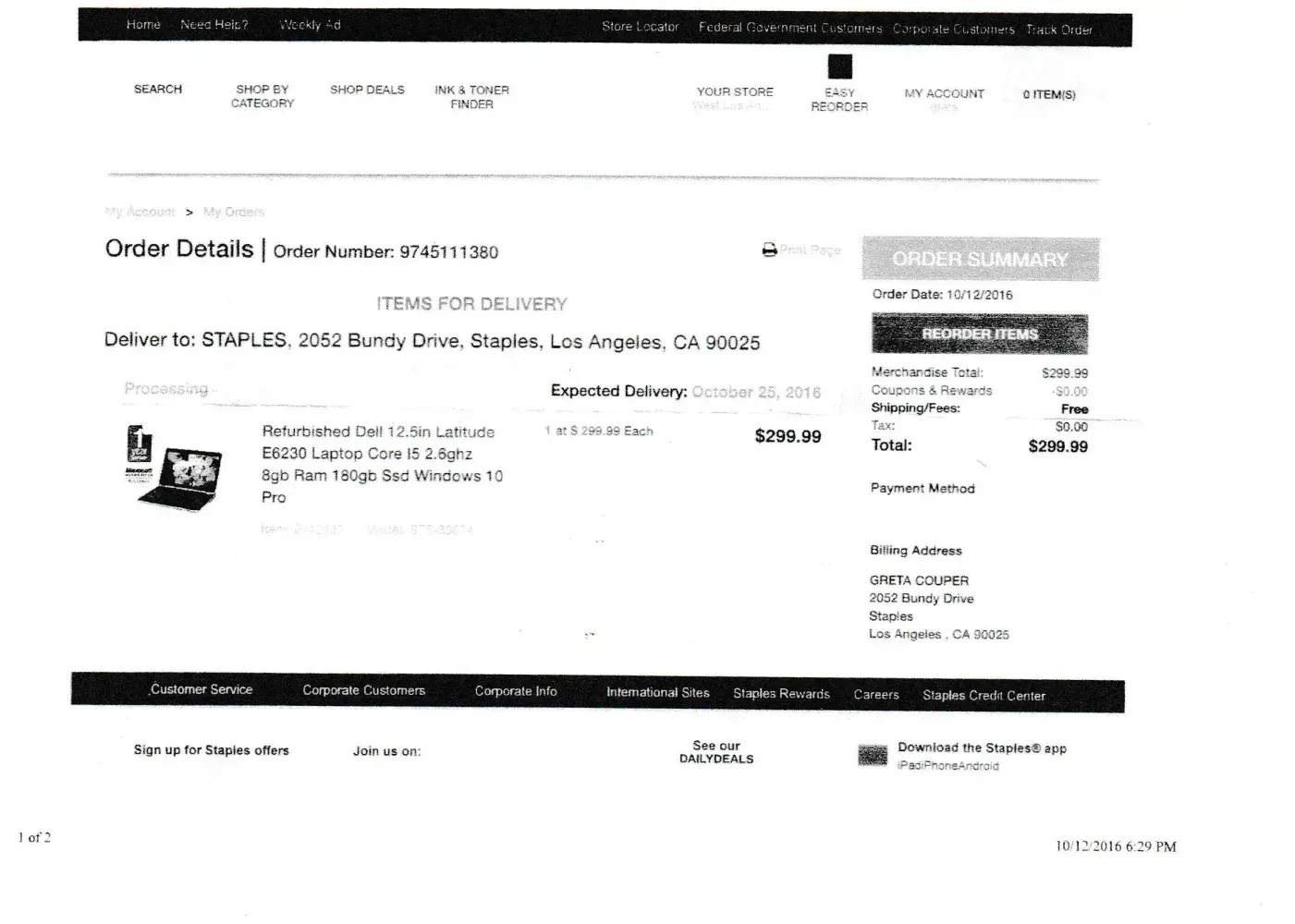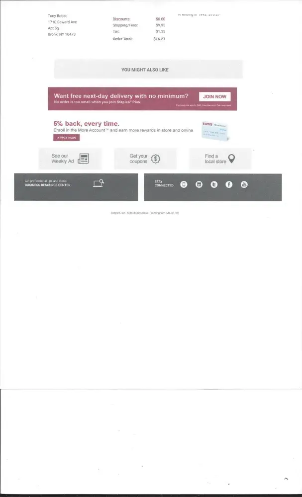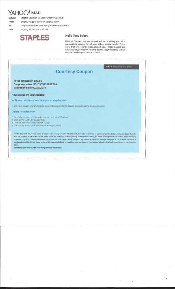 My name is Tony Bobet From New York City. I am filing an complaint to Staples.com. I was planning to order an item on October 27, 2018. The item that i order Ampad Quadrillie Pad 8 1/2 x 11 Quad Ruling Graph Paper 4 squares inches 50 sheet Pad. the amount of the item of $4.99. Order# [protected]. I pay with Courtesy Coupon from the amount of $20.00. When i ask for the assist. from Kenneth. He was the one was helping. He was lying to me. The Courtesy Coupon #[protected]. And, its Expiration on 02/28/2019. I want to an gift certificate.