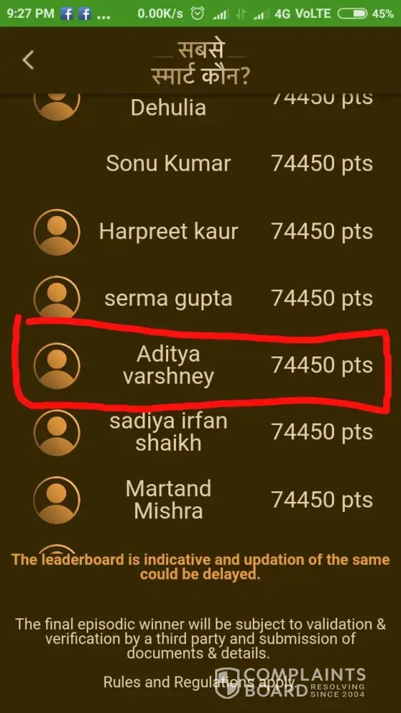 Hello, sir /mam good evening i play this game on the date of 24 /07 /2018, Tuesday and i score 74, 450 i am seen my name in the winners list But till now I didn't get any call or message ...I dont know What's going wrong in this game Please respond for this complaint .I hope for the best for you.. when u read this complaint then u call me on this no.
