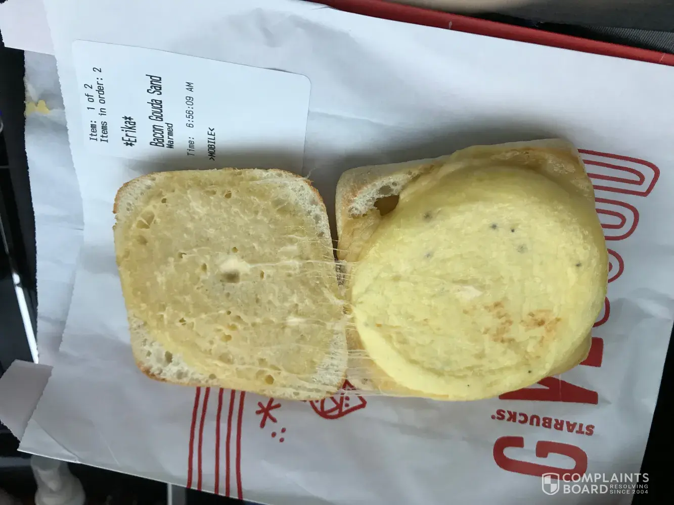 Again, i'm unsatified with another starbucks purchase. I purchased the bacon gouda and egg sandwich, and there wasn't anything bacon. So I just had an egg and cheese sandwich. I guess every time I order I have to check my food, this happened december 11, 2017 around 7 am. I didn't have time to drive back and complain, so here I am submitting this complaint.
