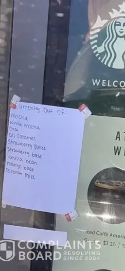 Waited in line at your drive-thru to order...I've attached a picture of the paper I found taped to your order screen. This is the third time I have came here only to be told the things I cannot order due to ingredients not being available. There is a serious problem going on here that needs addressed immediately.