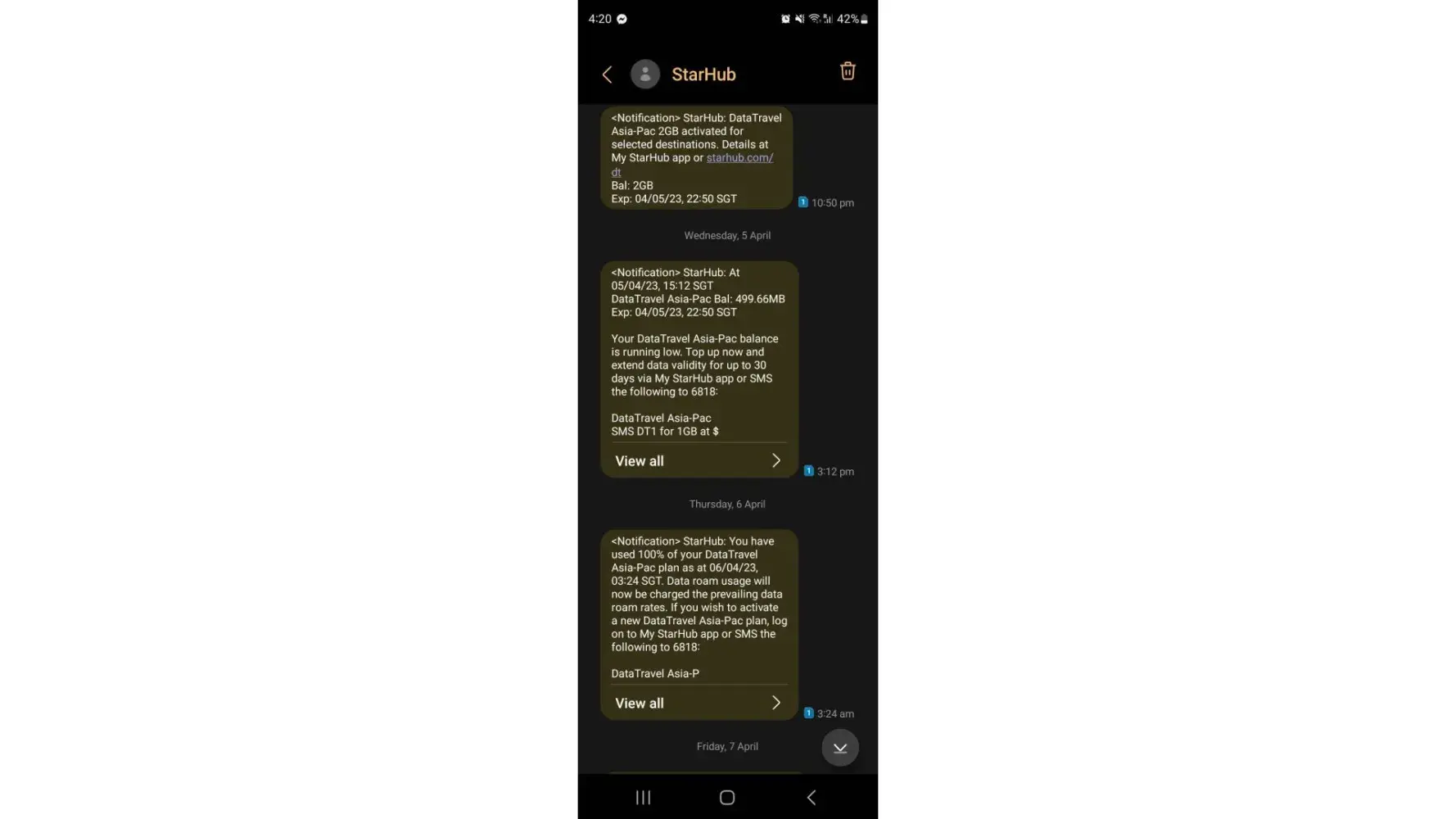 On the night of 6th April I was notified via SMS that the 2Â GB was used up and I top up immediately for 1GB until I was back in SG and received an SMS that my data had about 499mb left and expiring.