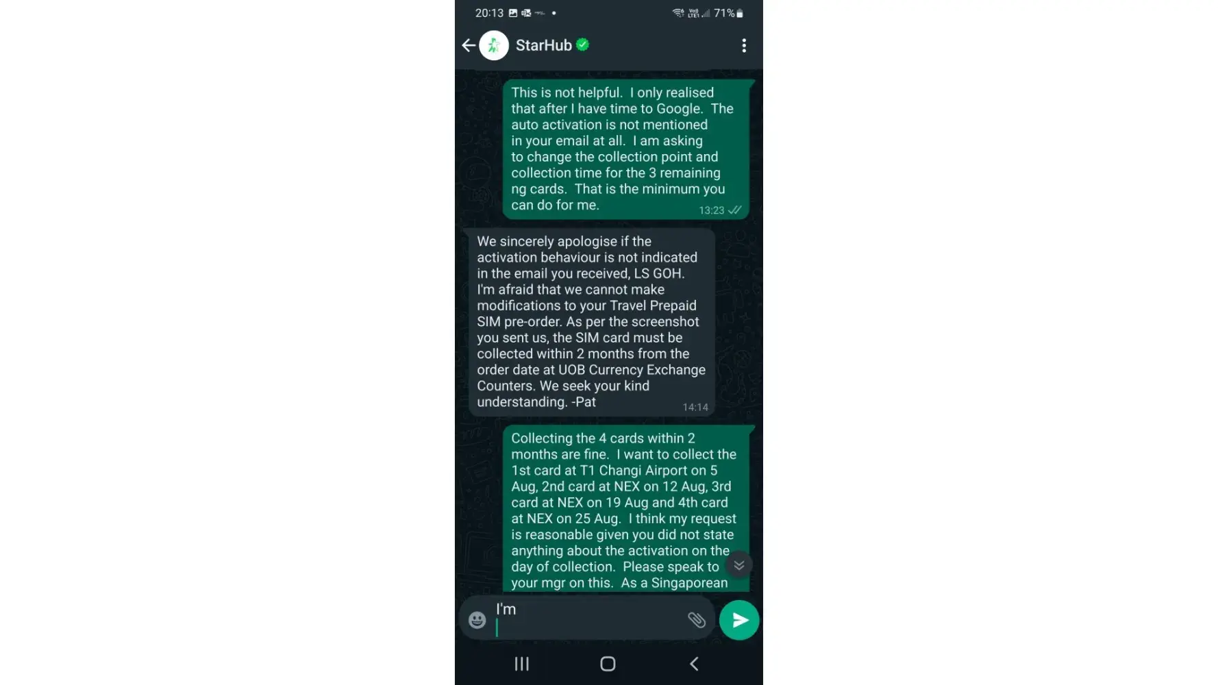 I ordered 4 prepaid SIM cards (see attached) as they do not seem to be able to be topped up. However, I did not know that they will be activated upon collection. I will be in Singapore for a month from 5 July to 5 Aug and hence bought 4 prepaid cards, each for 7 days thinking that I will activate it as and when I need it. Now after researching, I found that all the 4 cards will be activated on the same day. Note that this information about activation is not on the Changi airport website that I ordered the SIM cards neither is it stated on the vouchers sent to me. I am now asking to change the collection point and collection time for the 3 remaining SIM cards such that I will collect the 1st card at T1 Changi Airport on 5 Aug when I arrive in Singapore, 2nd card at NEX on 12 Aug, 3rd card at NEX on 19 Aug and 4th card at NEX on 25 Aug. I think my request is reasonable given the activation on the day of collection is not stated as mentioned above. I whatsapped Starhub and the help desk just said nothing could be done. As a Singaporean living abroad and now returning to Singapore for a month, this first experience is not very welcoming 1I want to reiterate that your email to me does not even talk about activation on the same day. My trip to Singapore is on Tuesday (5 August) and I have given ample time to Starhub to resolve the matter. Your help desk colleagues' feedback contradicts with your website which allows customers to change the place to collect the card. I also learnt subsequently that I cannot buy more than 3 SIM cards yet when I bought 4 cards on named basid, your system just happily accepted my orders. I would expect your system to decline my purchase. If I cannot collecy rtg card at a later date and at a different collection point, I want refund of my money. As a Singaporean living abroad and now returning to Singapore for a month, the current experience is very bad.