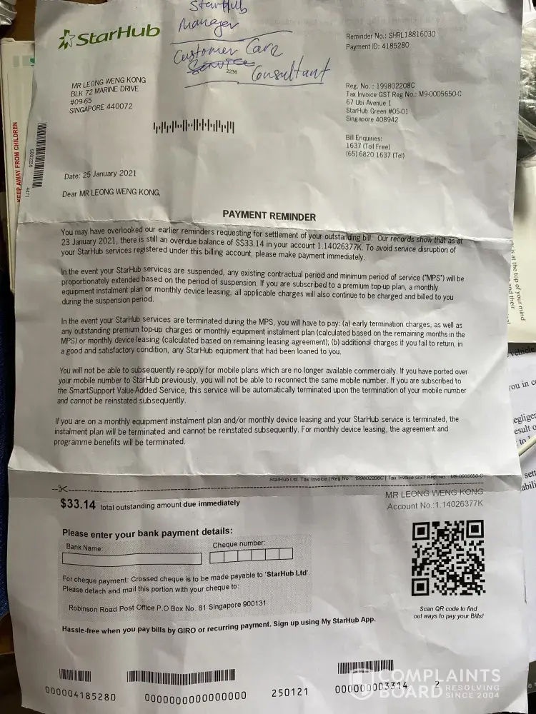Can some one assist me because I think this reminder payment is ridiculously annoying as I said I had settled in person at StarHub Plaza Singapura office in 2018? It has been causing me unnecessary time and effort to reach out to starhub!