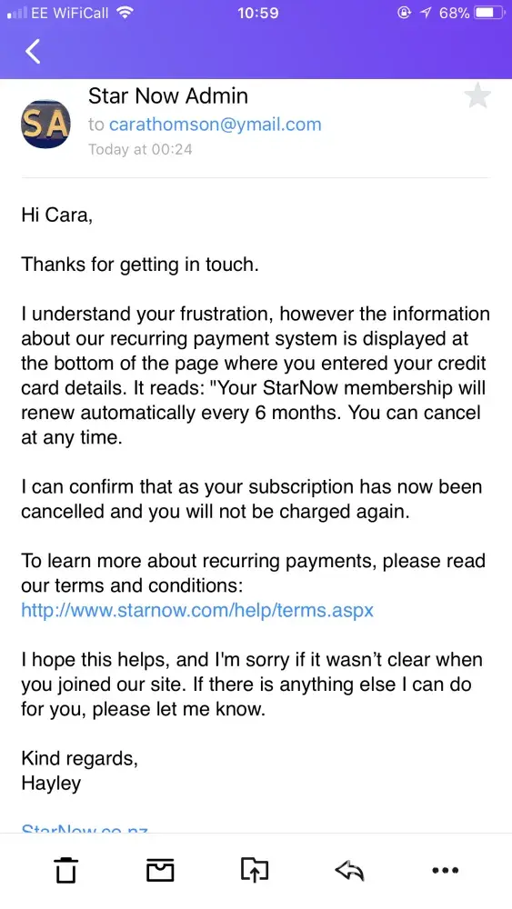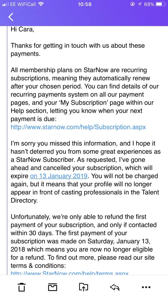 I have been a loyal paying member of StarNow for many years, in fact since it’s inception as a business. I pay via direct debit and have done so for years, so 6 monthly payments are taken out of my account.