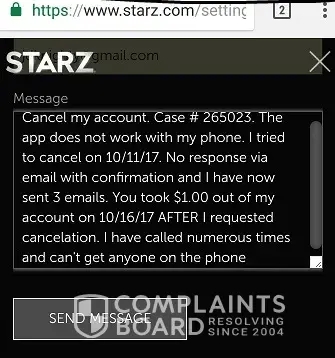 Case number 33292. I have been trying for 3 months to cancel this but when I think that I id I get money taking out of my bank account. I have check and I have no other account with starz or have another email that I have used for this. I sent all this thru nthe email that I received and hgave NOt got an answer yet. Wish I Never got it. I just went on my lap top and type in starz and got it that one.