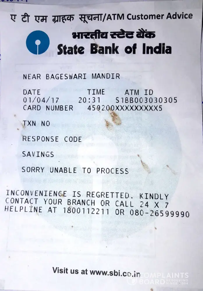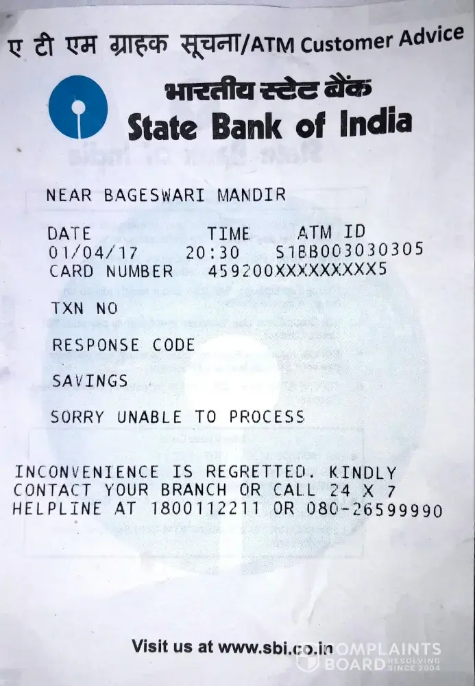 On dated 4th of jan I have went to sbi atm of dispur branch with atm id "s1bb003030305" to withdraw an amount of rs. 4500 but atm has responded as "unable to process" so again I have tried one more time to withdraw rs.4000 and again I hv tried to withdraw 4500 but again same problem occurs... And at midnight of 5th of jan from my account deducted for rs.13000... And from that 13000 one of amount of rs.4000 have been reversed in my account bt rest amount of rs. 9000 has not been reversed yet... Kindly resolve this issue immediately asap..