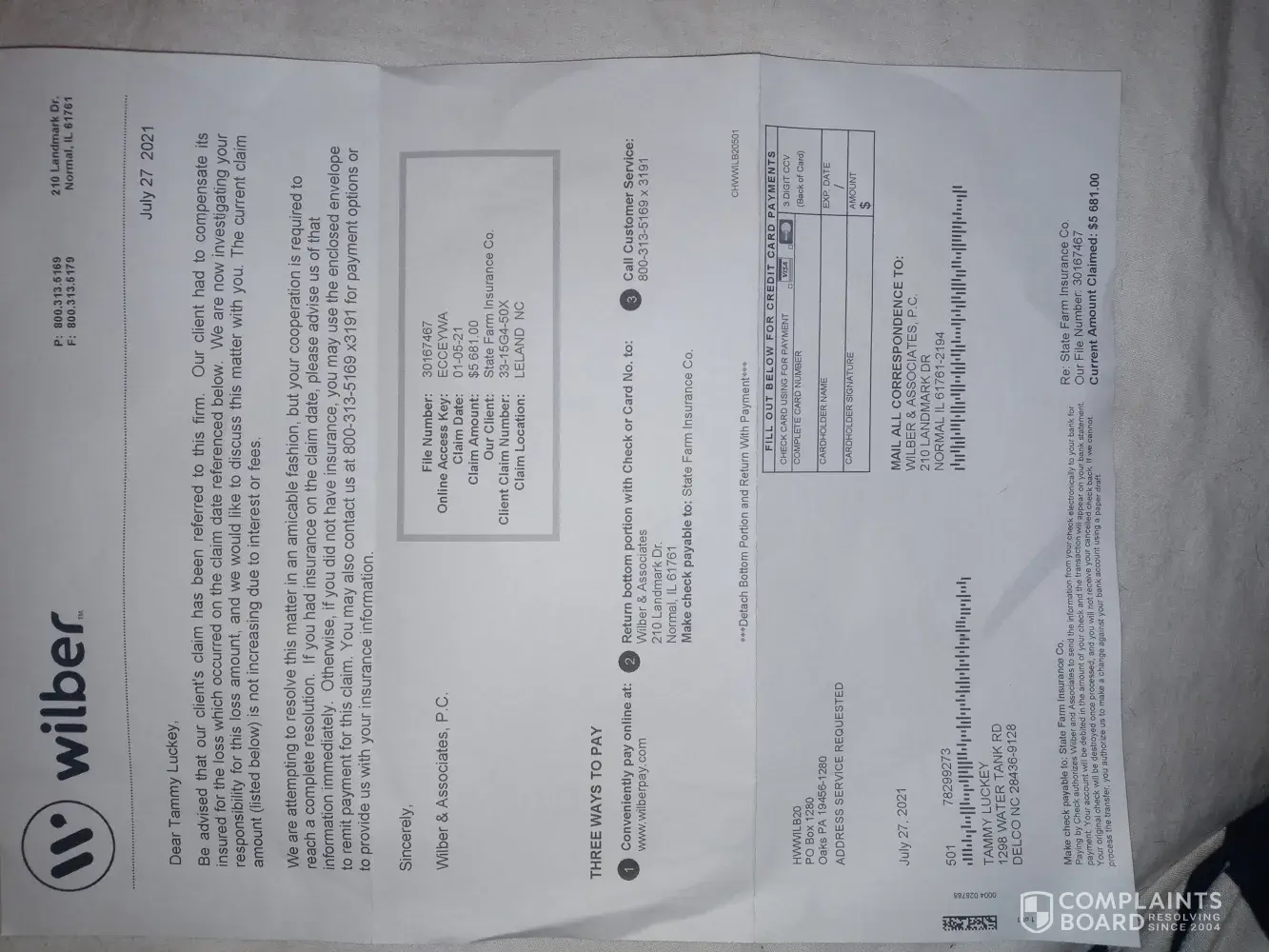 I am writing this in reference to the claim from State Farm that I owe $5, 681 for Miss Hamilton's car when I do not owe this money for her car she rear-ended my vehicle and the accident was her fault all the damages to my vehicle were paid for out of my pocket or from my own insurance I'm not reliable for fixing her vehicle so this is a false claim