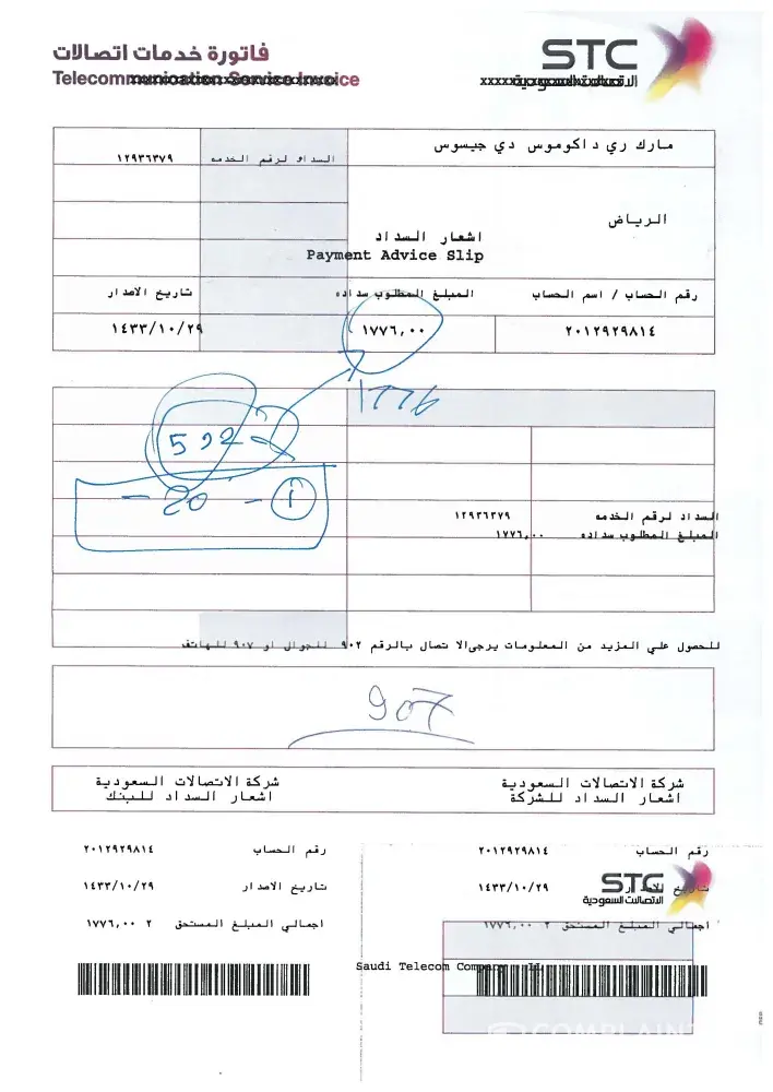 I have a problem with my Internet Bills in the last two months my compensation are only SR592 when I go to STC Olaya Branch to settle my payment I was amazed that my payment is now SR1776 and I ask them why I need to pay this huge amount the only thing that STC owe me is SR592 for two months. When I calculate SR1776 it is consuming of 6 months. I need to disconnect this due to transfer of residence.