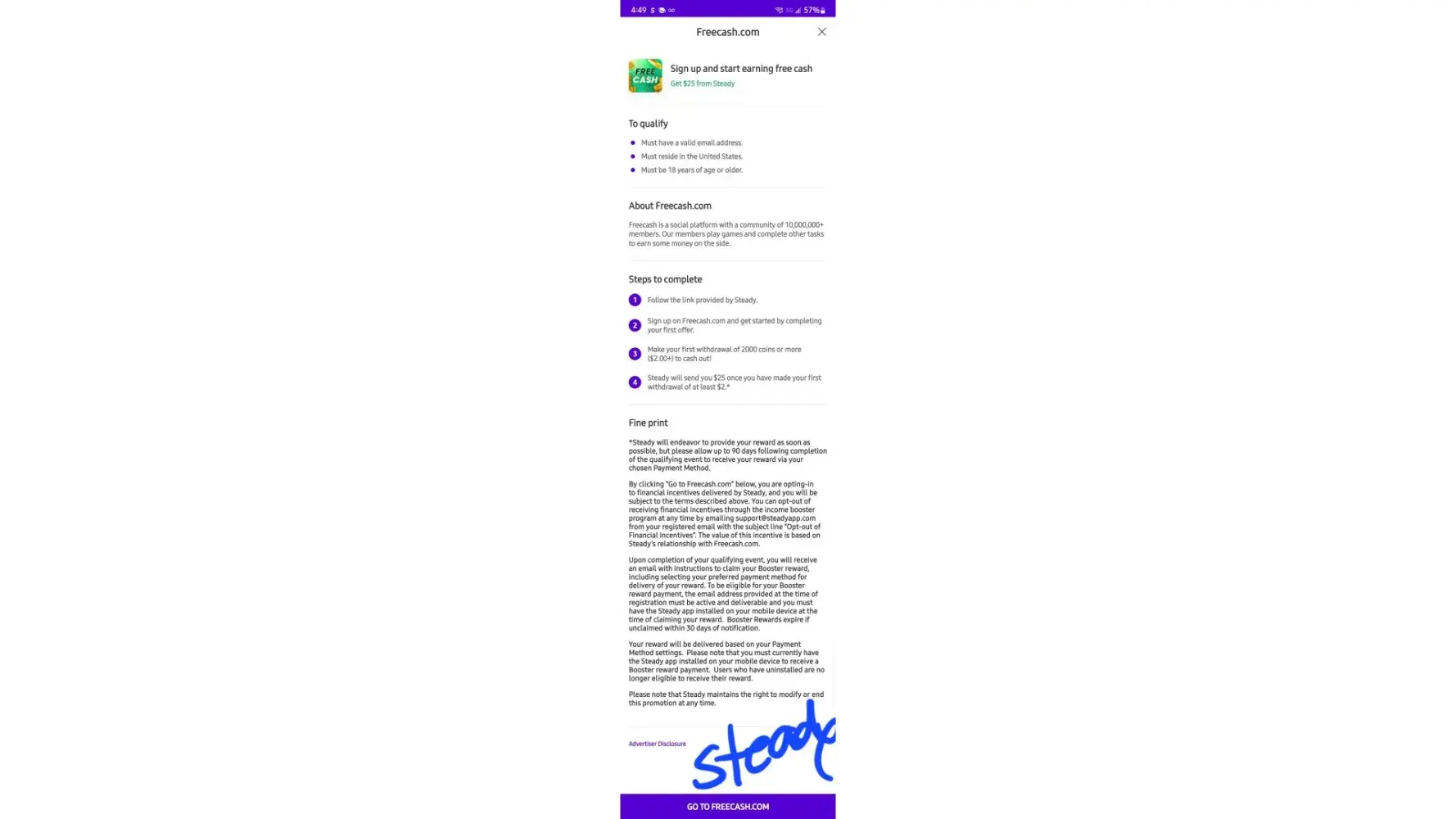 I completed the Steady income booster for signing up to complete my first Doordash delivery. I completed my delivery the same day. I reached out to Steady for my booster payment. They refuse to pay because they do not have a screenshot of the "Welcome congratulations" email from Doordash. If you read the terms and conditions, it does not state that Steady must have an email screenshot. I've completed all the necessary steps from my end but Steady refuses to pay. I would like the money that was promised to me for completion. I've attached proofs and Doordash stating when the account was made and if it's active. This company just wants you to link your bank account so they can steal your information.