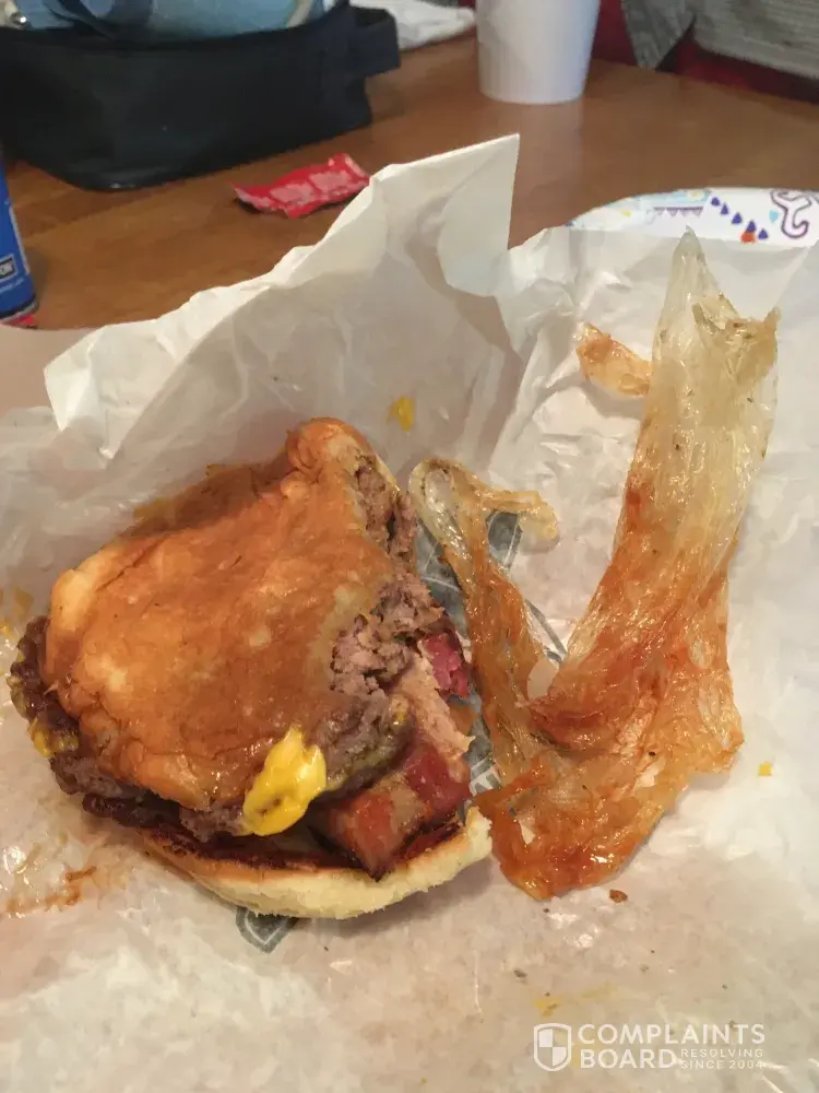 After church went to Steak & Shake to use gift card. Placed order at drive thru window and took order home to eat with wife and niece. I got the pork/ hamburger and on the second bite realized something wasn't right and pulled what appeared to be a vinyl glove from my sandwich. I didn't eat anymore and neither did my wife or neice. I took it back to Steak ...