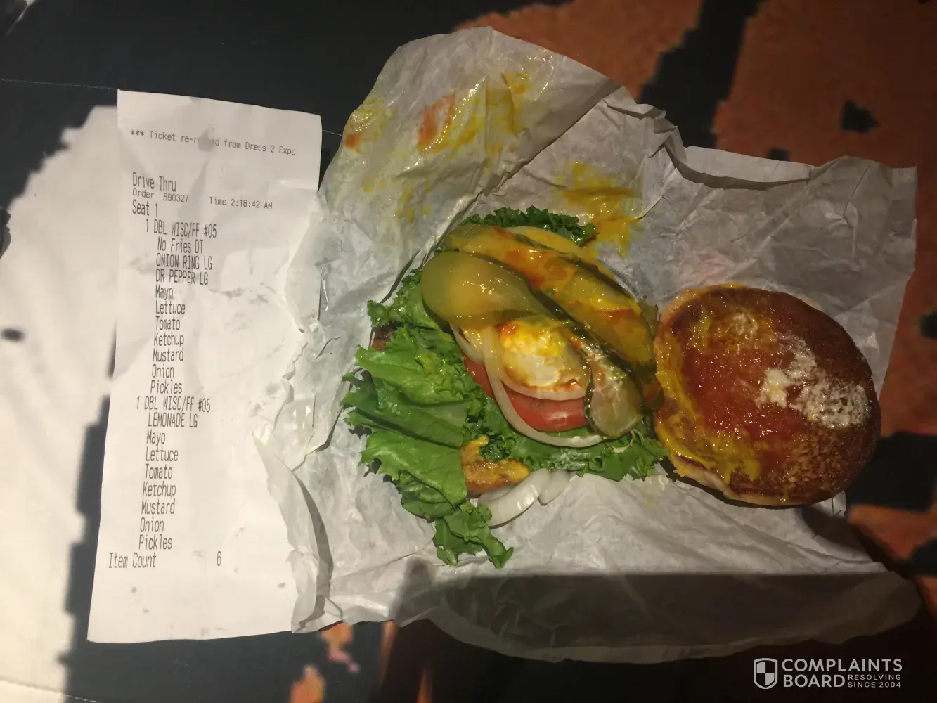 Today I went through the drive thru and ordered two Wisconsin buttery burgers. Upon waiting 25 min for my order. I drove home to open two mystery burgers. The condiments are not what are on the burger I ordered as seen in photo I attached. I should have just checked at the drive thru but because I waited a bit I went straight home.