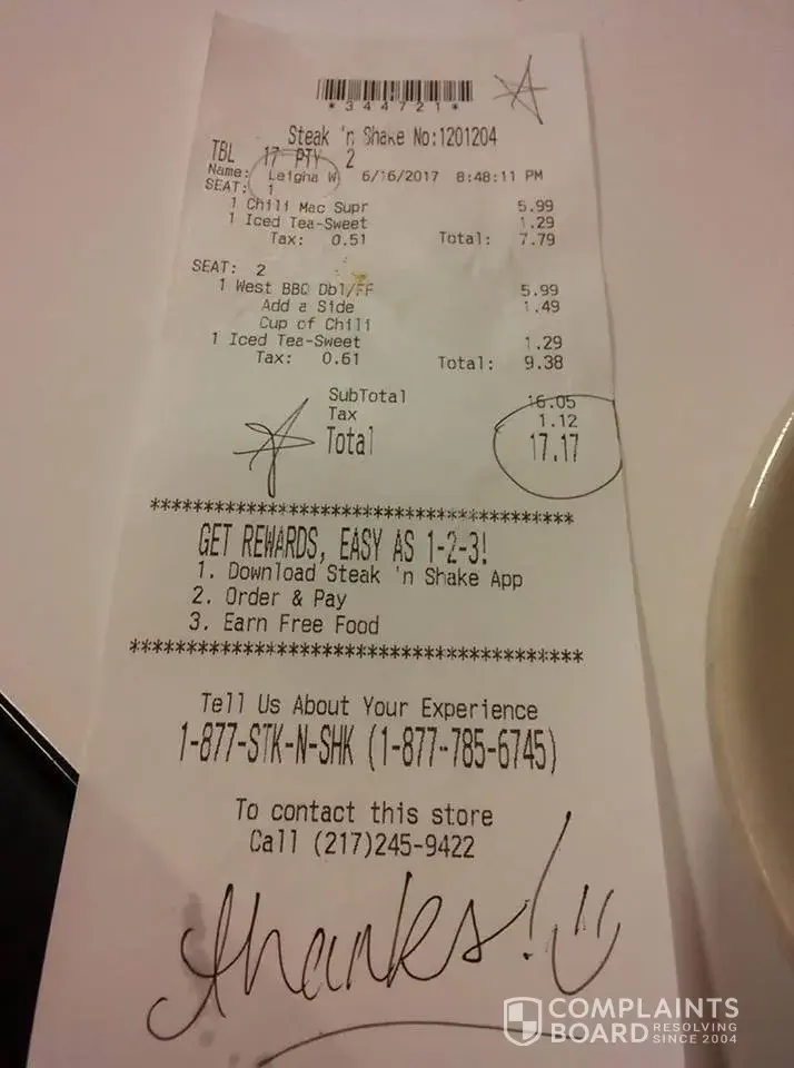 Steak 'n Shake earns a 1.0-star rating from 1 reviews and 1732 complaints, showing that the majority of diners are dissatisfied with their meals.