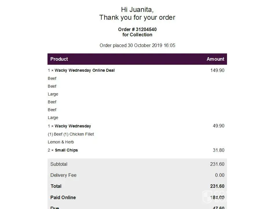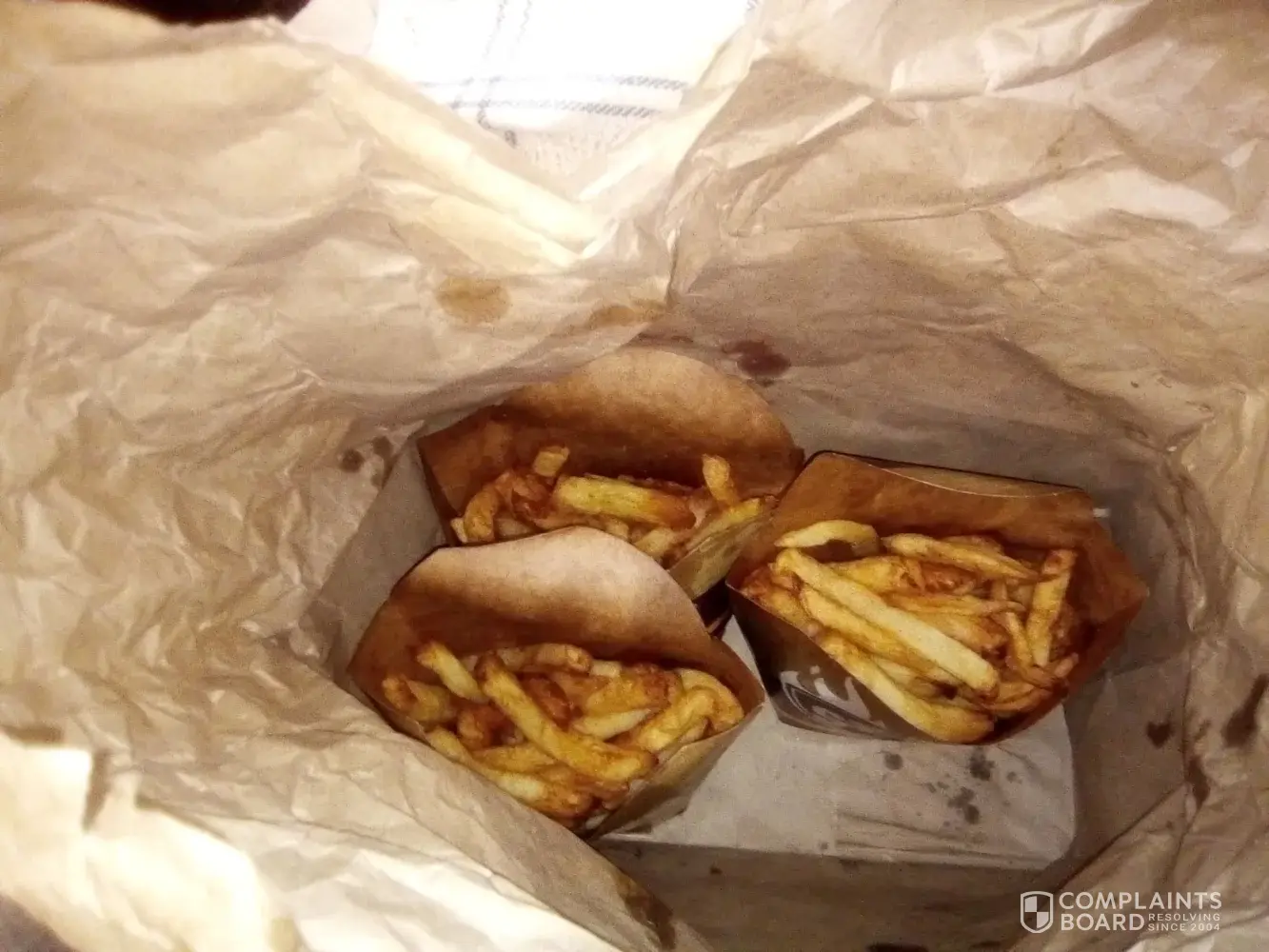Ordered good on line when the driver got here he did not have the correct change on opening our food er found the chips we had ordered as extras where burnt we phoned to complain the driver then went back and brought us apparently fresh chips which where exactly the same as the first ones