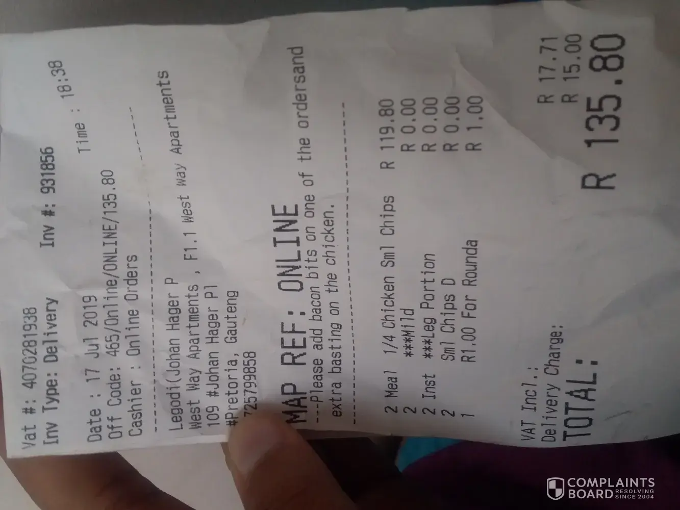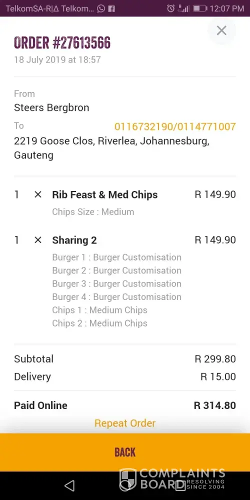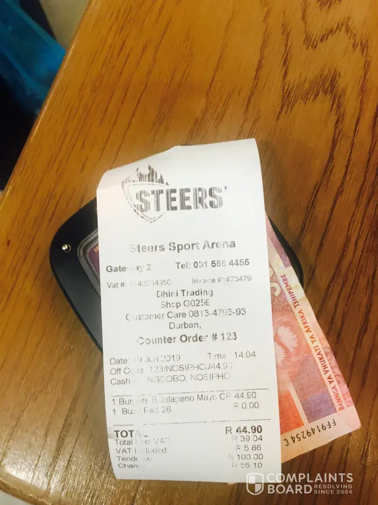 Also there was a delivery guy called "Collen" and that's the only person I remember as I didn't get the name of the people that spoke to us but the date is on the 17th July 2019 around 18h38. Steers in Philip Nel.
