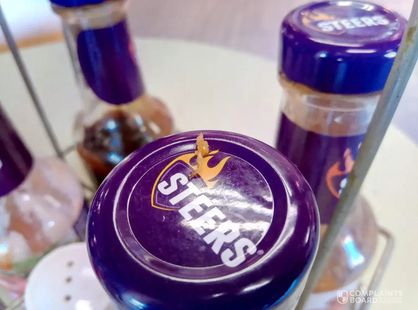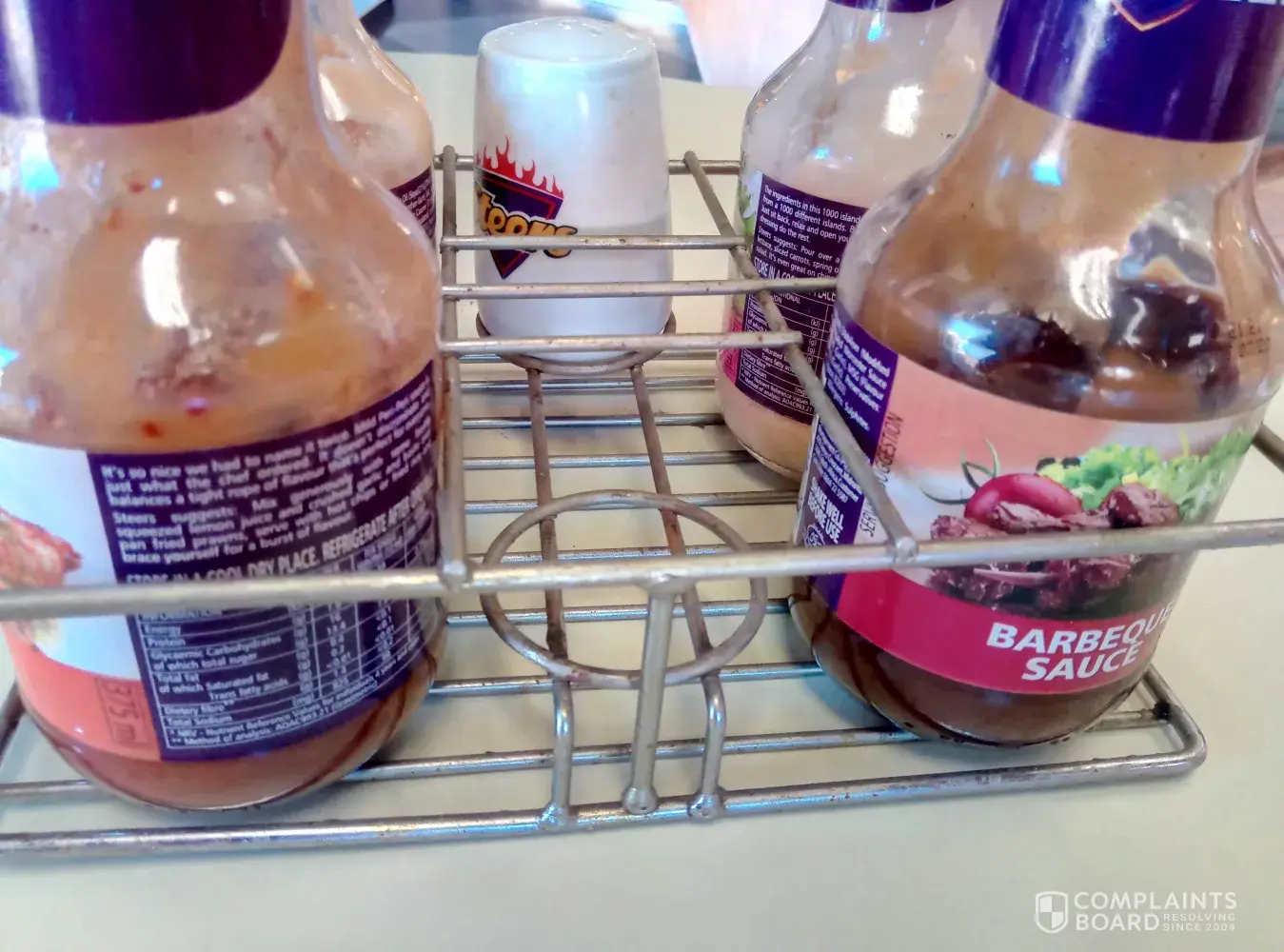 Steers dirty table and dirty catsup bottles
