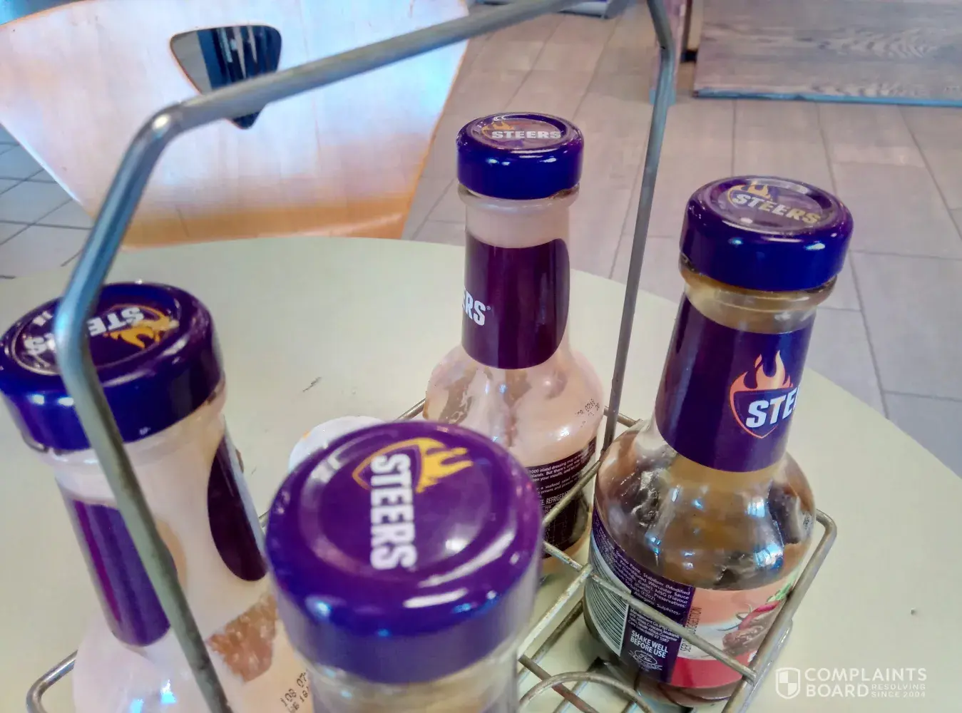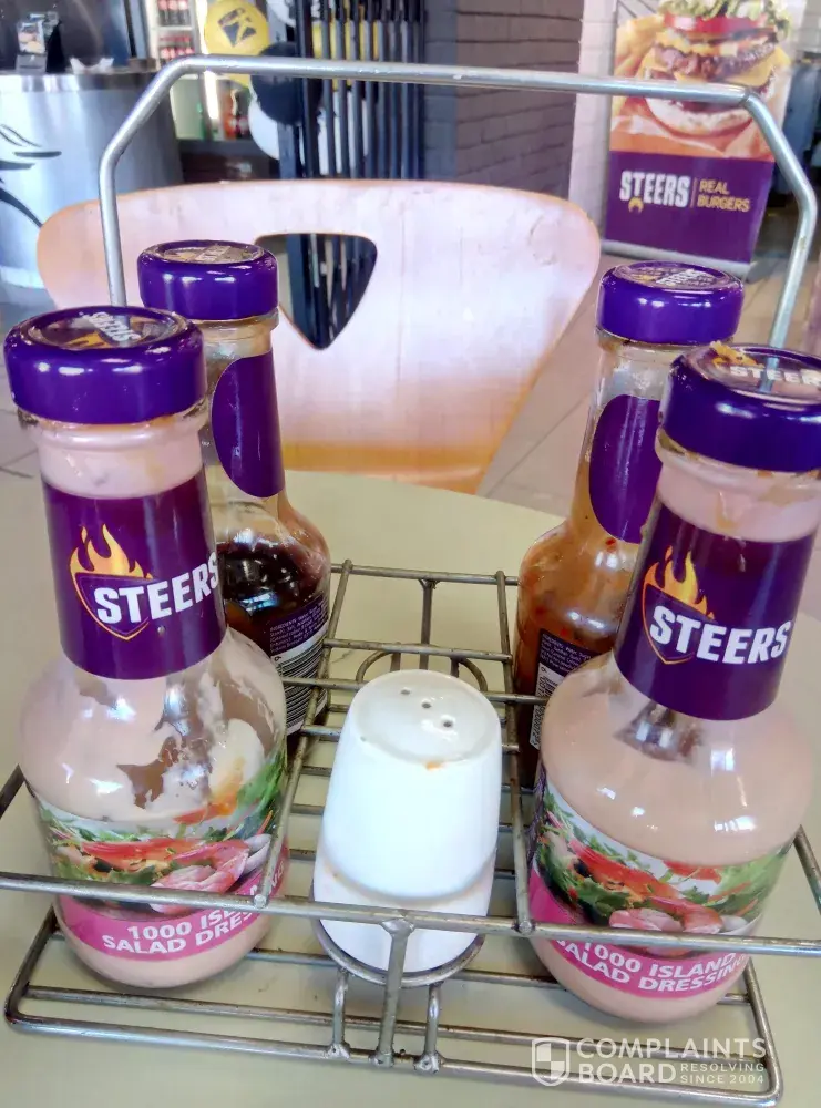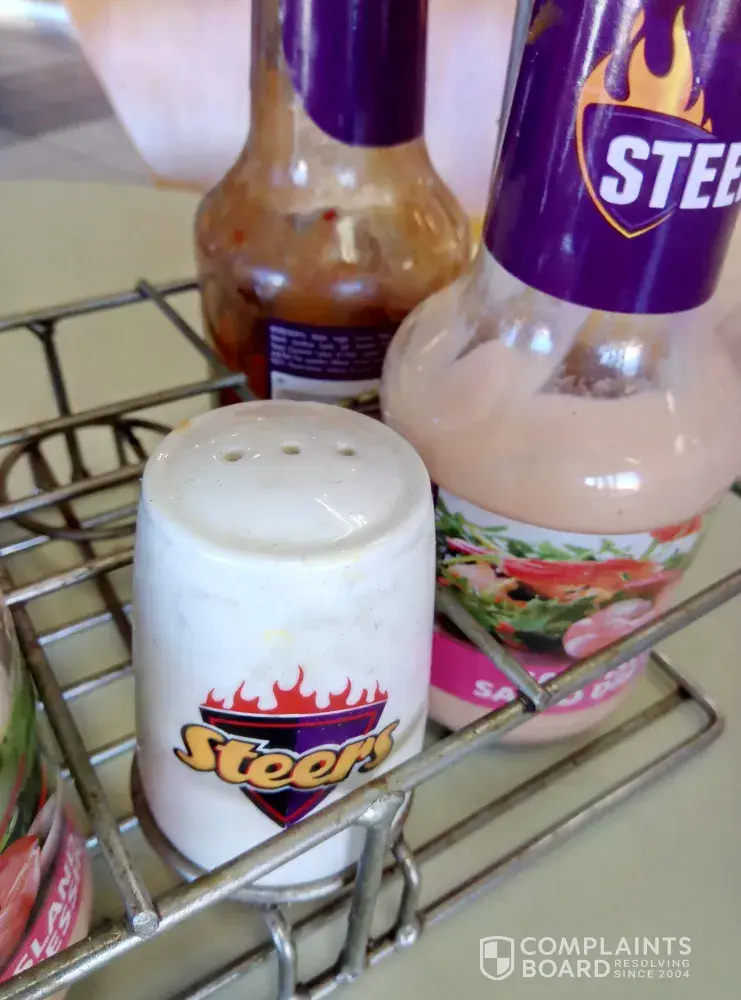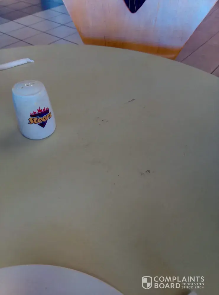My family and I visit Steers in Saxby Center, Centurion on 28 June at around 11h00am. The table were we sat were uneven I had to balance it with my shoe. The table were dirty. The salt and catsup bottles were dirty and full of old and hart catsup. On one of the caps was a small peach of chip. This was not a very nice experience we had seeing that it was a special occasion for my family and me.