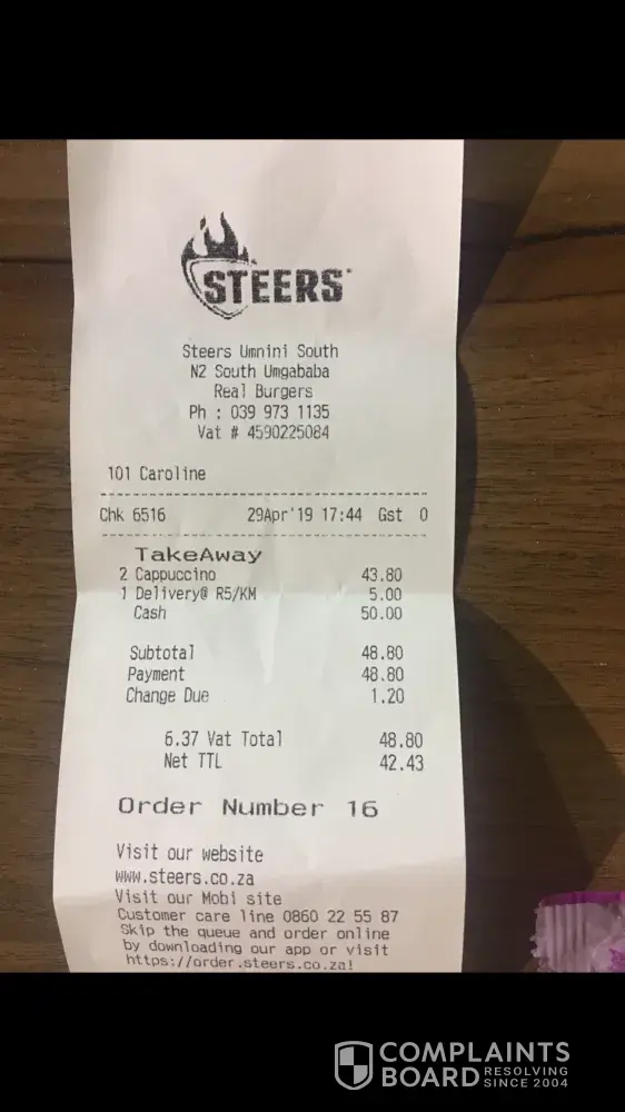 I have been meaning to ask this for the last couple of months but I have been hectic. We stopped a certain steers to buy coffee(please refer to the location on the receipt attached) and we were charged a delivery fee. We enquired about this fee and we were told that it's a standard. Please help me understand how can walk in customers be charged delivery fees. I love steers as a brand and model but ever since that purchase Iv been sceptical to even walk in to any other Steers.