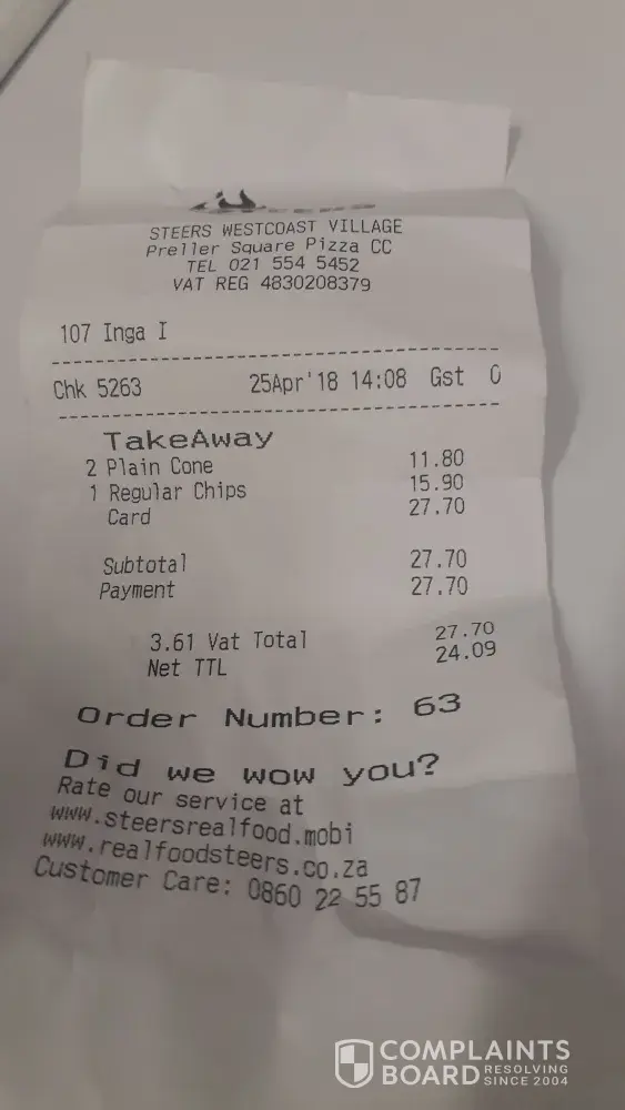 I went to west coast villadge amd thought i will get me some hot chips from Steers. A small cost R15.90 and thought nothing to pay that amount because i knew it will be worth the money. I didnt think of writing to you and complaint but I just thought people are getting ripped off by these advertising. I dont know if Steers think they give their customers value for their money or is it the people that is trained to serve people scrap from the fryer. i was so disgusted because i paid for chips just to be thrown away. This is so low not even pick nd pay will serve people chips like these, that you sell to customers.