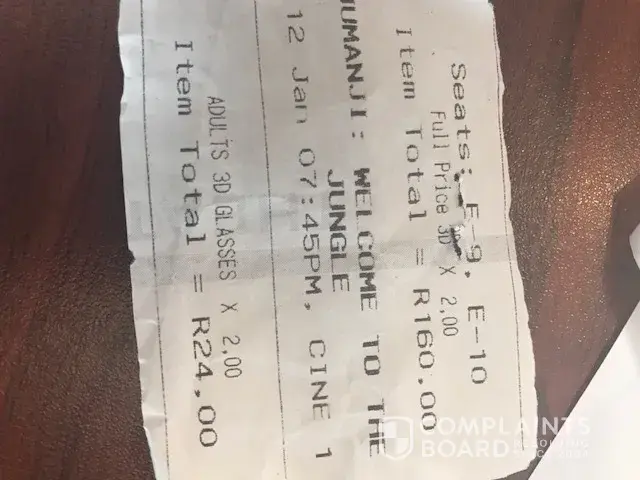 Good day. My husband and I went for a Movie at Carnivall City Ster Kinekor on 12 Jan 2018 to watch Jumanji in 3D, needless to say we never did.