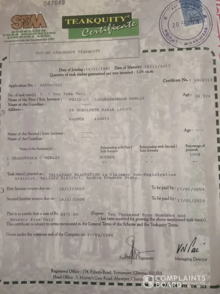 I had purchased 5 trees against Sterling Tree Magnum project of teak plantations in Chenni through their office in Delhi in the year 1992. They had asked me to send my original documents to Chennai office to release my money, accordingly I had sent the original documents to them. But they did not release the money till date.
