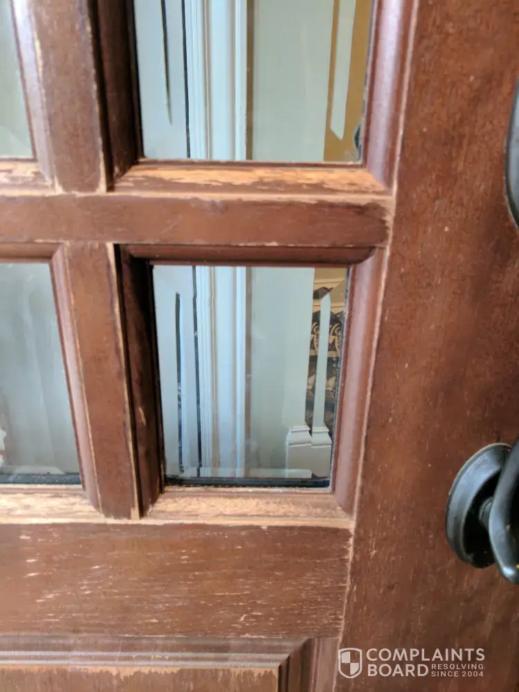 I purchased front door couple of years ago and the door has begun to weather one year after having it. It's now 3 years old and has weathered terribly. The door has splitting wood lost its color and condensation built up between the glass. I spent $1, 000 on the door from Home Depot and could not be more disappointed. Also the door is located under a porch with a 9ft overhang. It has never been touched by any sort of precipitation.