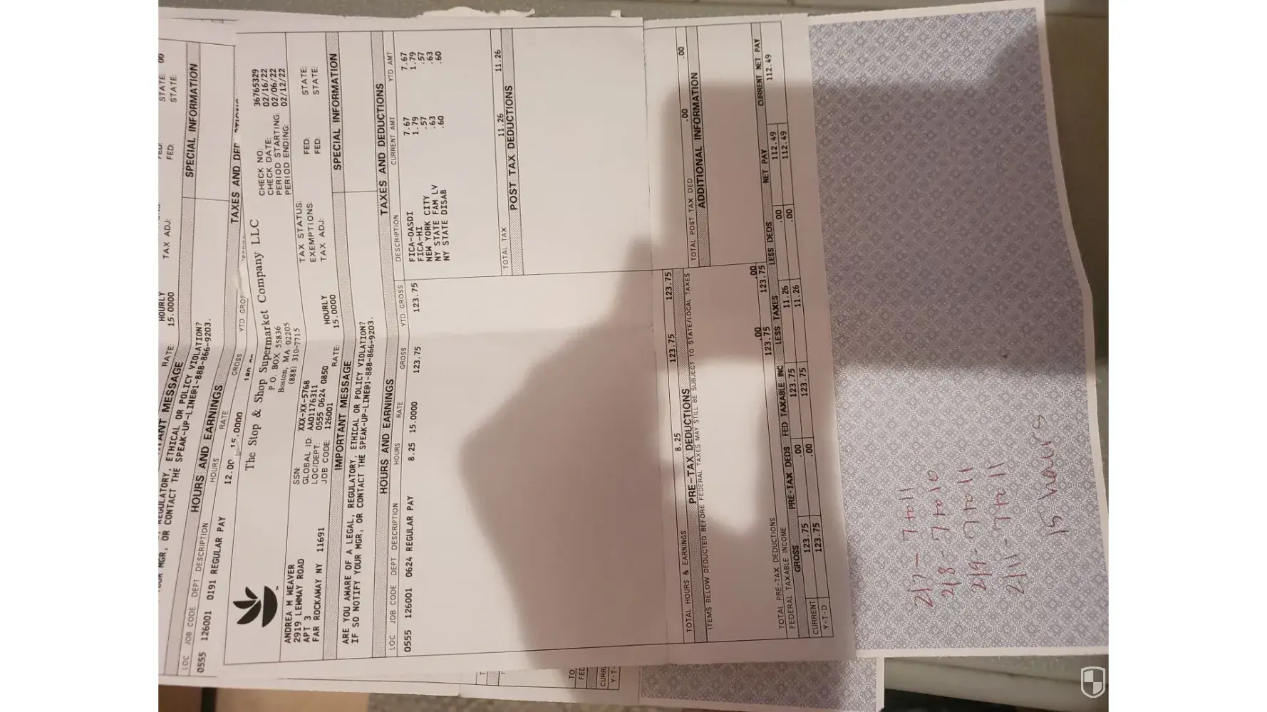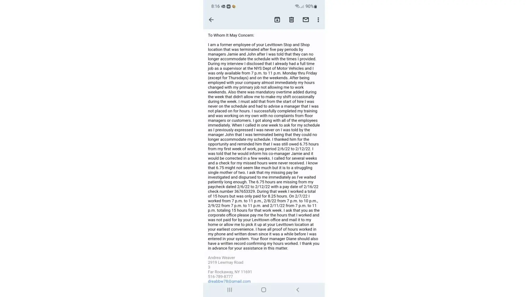 I am a former employee of your Levittown Stop and Shop location that was terminated after five pay periods by managers Jamie and John after I was told that they can no longer accommodate the schedule with the times I provided. During my interview I disclosed that I already had a full time job as a supervisor at the NYS Dept of Motor Vehicles and I was only available from 7 p.m. to 11 p.m. Monday thru Friday (except for Thursdays) and on the weekends. After being employed with your company almost immediately my hours changed with my primary job not allowing me to work weekends. Also there was mandatory overtime added during the week that didn't allow me to make my shift occasionally during the week. I must add that from the start of hire I was never on the schedule and had to advise a manager that I was not placed on for hours. I successfully completed my training and was working on my own with no complaints from floor managers or customers. I got along with all of the employees immediately. When I called in one week to ask for my schedule as I previously expressed I was never on I was told by the manager John that I was terminated being that they could no longer accommodate my schedule. I thanked him for the opportunity and reminded him that I was still owed 6.75 hours from my first week of work, pay period 2/6/22 to 2/12/22. I was told that he would inform his co-manager Jamie and it would be corrected in a few weeks. I called for several weeks and a check for my missed hours were never received. I know that 6.75 might not seem like much but it is to a struggling single mother of two. I ask that my missing pay be investigated and dispursed to me immediately as I've waited patiently long enough. The 6.75 hours are missing from my paycheck dated 2/6/22 to 2/12/22 with a pay date of 2/16/22 check number [protected]. During that week I worked a total of 15 hours but was only paid for 8.25 hours. On 2/7/22 I worked from 7 p.m. to 11 p.m., 2/8/22 from 7 p.m. to 10 p.m., 2/9/22 from 7 p.m. to 11 p.m. and 2/11/22 from 7 p.m. to 11 p.m. totaling 15 hours for that work week. I ask that you as the corporate office please pay me for the hours that I worked and was not paid for by your Levittown office and mail it to my home or allow me to pick it up at your Levittown location at your earliest convenience. I have all proof of hours worked in my phone and written down since it was a while before I was entered in your system. Your floor manager Diane should also have a written record confirming my hours worked. I thank you in advance for your assistance in this matter.