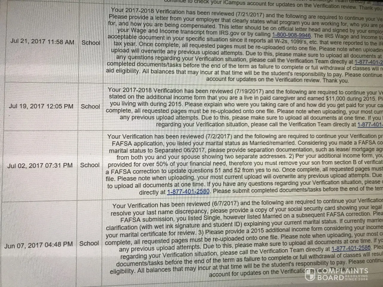 On August 2, 2018, I spoke with Danny Lockwood on the phone. I explained all of these facts to him and he said that he would assist me. He said he will ensure none of this nonsense holds up my degree and if I do owe anything, he would stretch out the payment plan and enable me to walk. But he was smart and said all of this on the phone…I wonder where he is now. He disappeared as well. He encouraged me to go through the motions with Financial Aid. I sent W2s, income statements (I was married in October 2017 and all of a sudden, his income was important). I gathered all of that information, it was lost in the mail, I kept requesting from the IRS all of these documents. The FA department will not accept e-mails and I do not have a fax machine and it would cost a small fortune to have staples fax it, so I was reliant on a coach to upload my information.