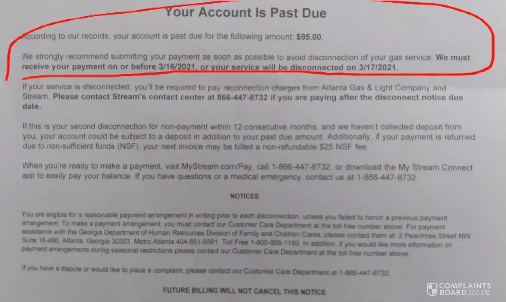 Stream energy cut my gas off today, march 10th. I received a notice that I have to pay the overdue balance by march 16th and the cutoff date would be march 17th. When I calledcustomer service they stated that I was told march 8th is the cutoff date. I do not have any notice about the march 8th cut off