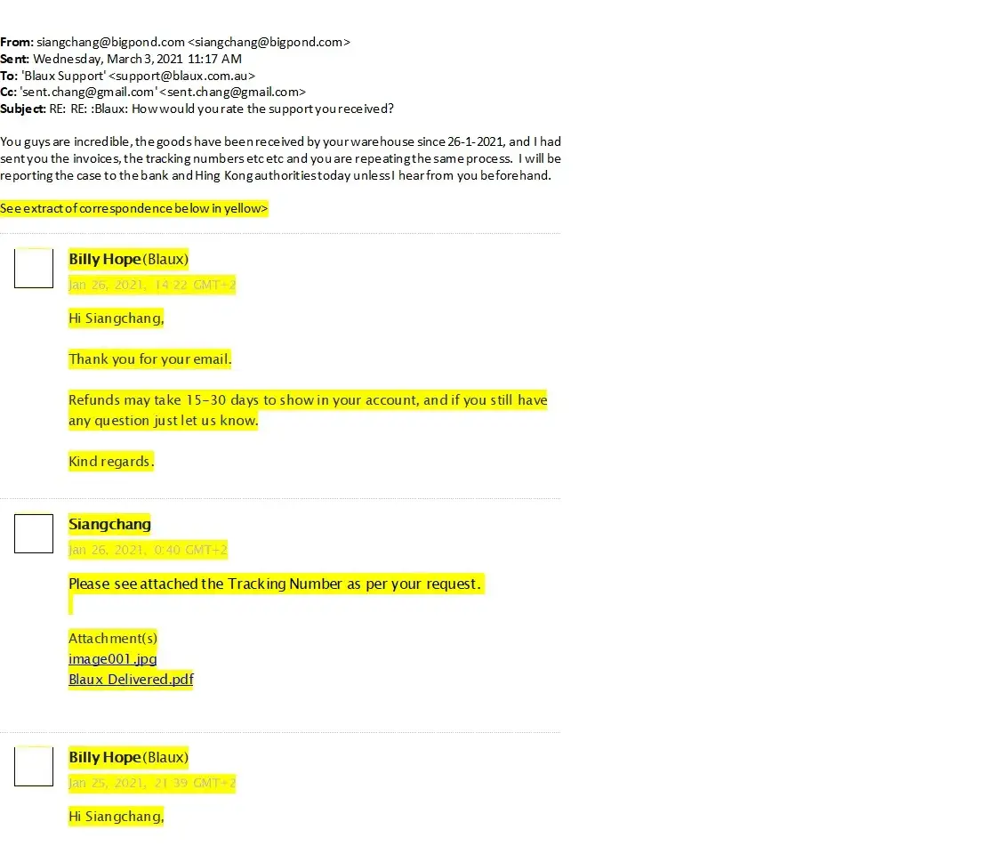 2 March 2021 (35th day)-Contacted Blaux and told them I have not received the refund