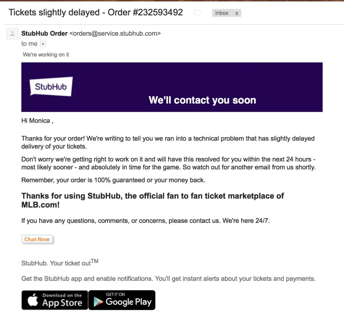 StubHub overnight hair ended up being 4 days later