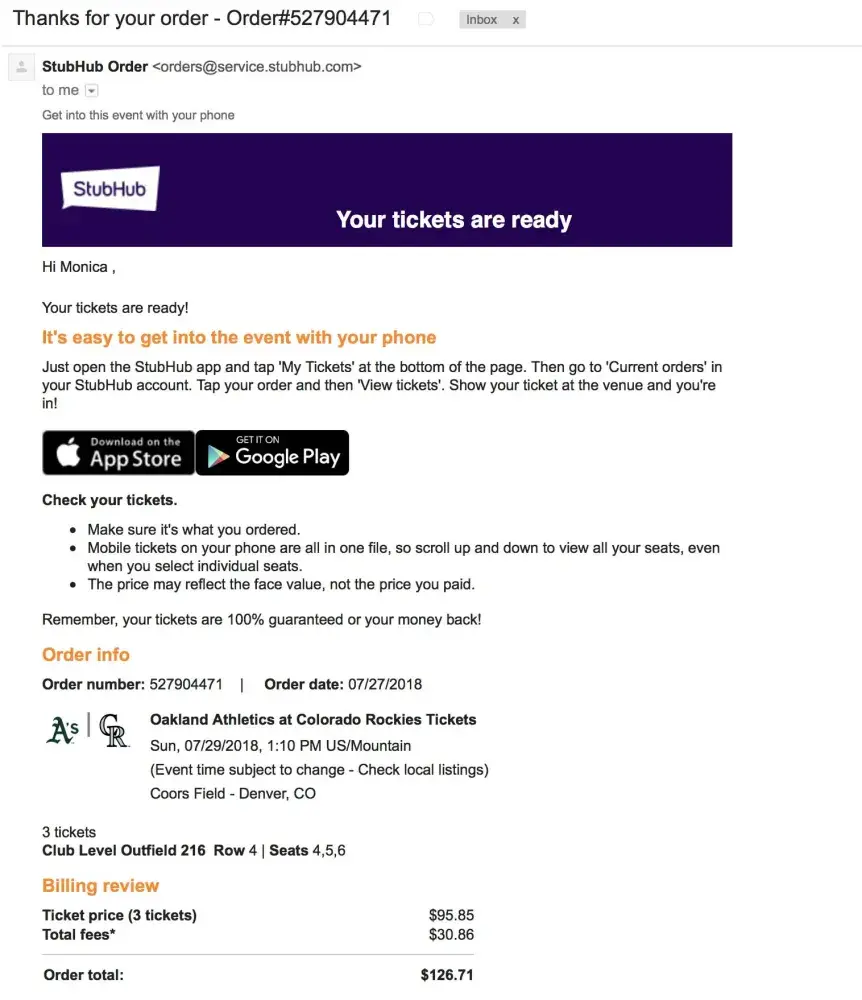StubHub ticket purchase