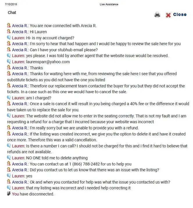 StubHub complaint/disappointed