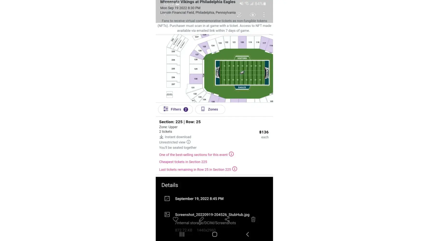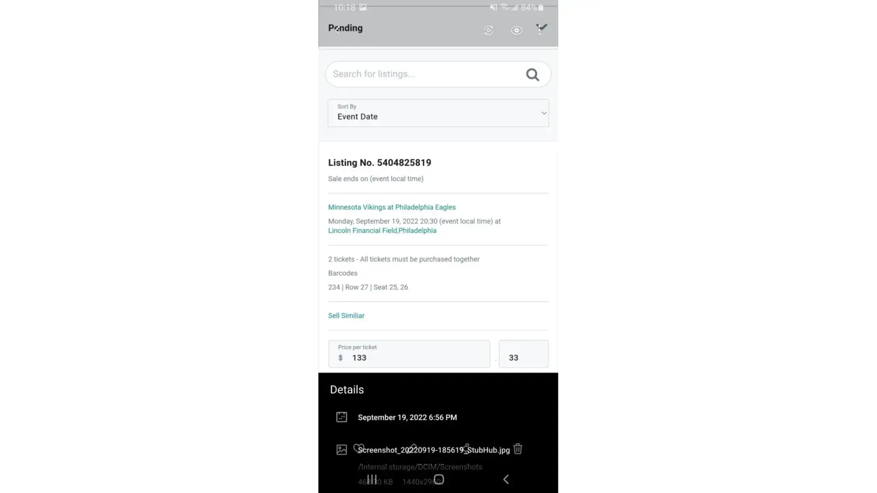 Game was Eagles vs Vikings in Philadelphia, PA on Monday night September 19th. That morning I woke up and seen tickets didn't sell yet so I lowered the price. Around lunchtime or after I checked and stubhub site said tickets were pending. I thought it was weird because I didn't receive an email like I usually do. Once I got home from work I checked again and still said pending. I went into active listing but my tickets were not available.