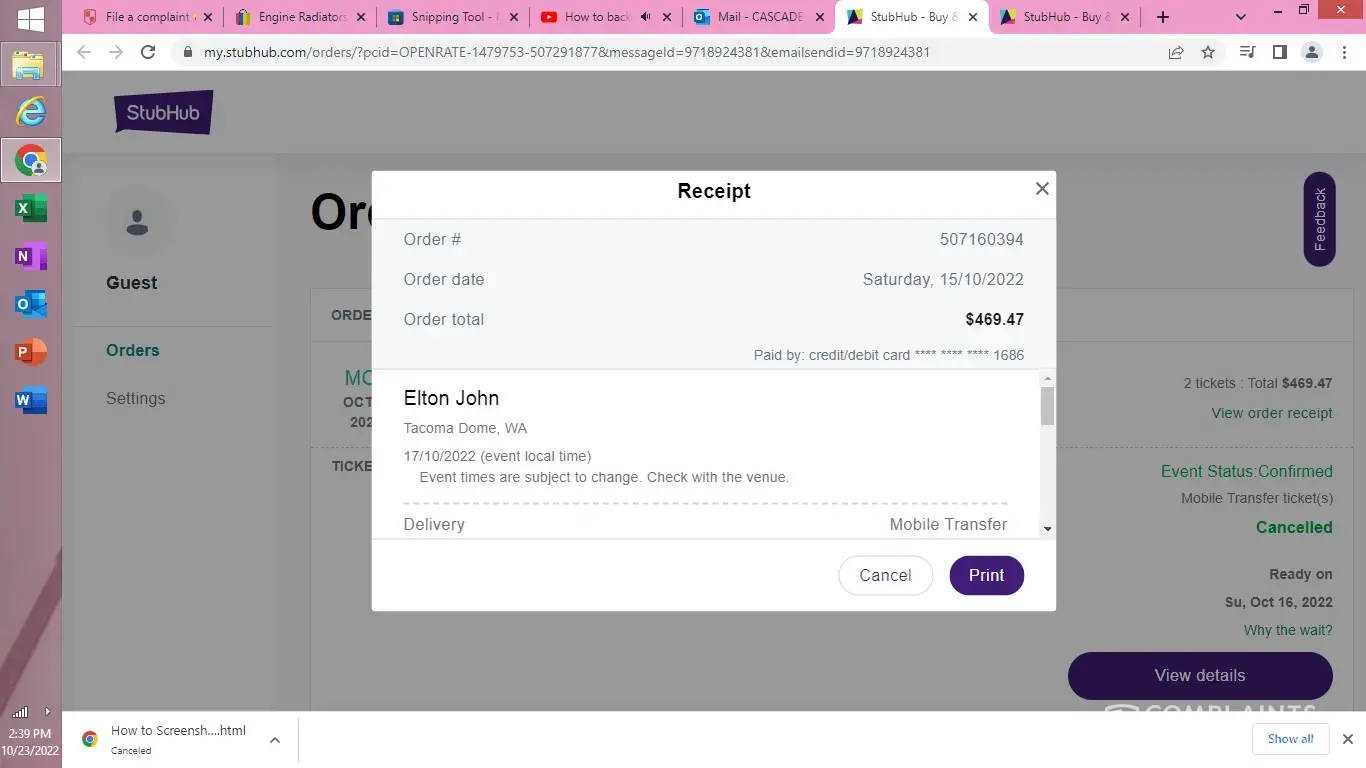 The Stubhub order number I'm disputing is #[protected]
