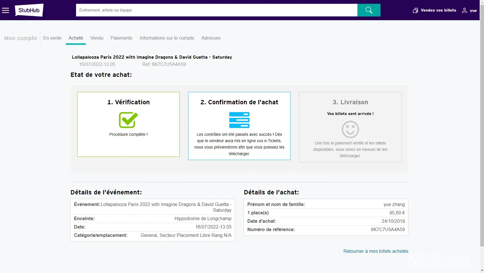 I booked a ticket (Reference number:6K7C7U5A4A59, 95,60 €, 24/10/2019) for the show of Lollapalooza Paris 2022 with Imagine Dragons & David Guetta, however, the ticket is not shipped on time, and there is no refund of ticket money to me.
