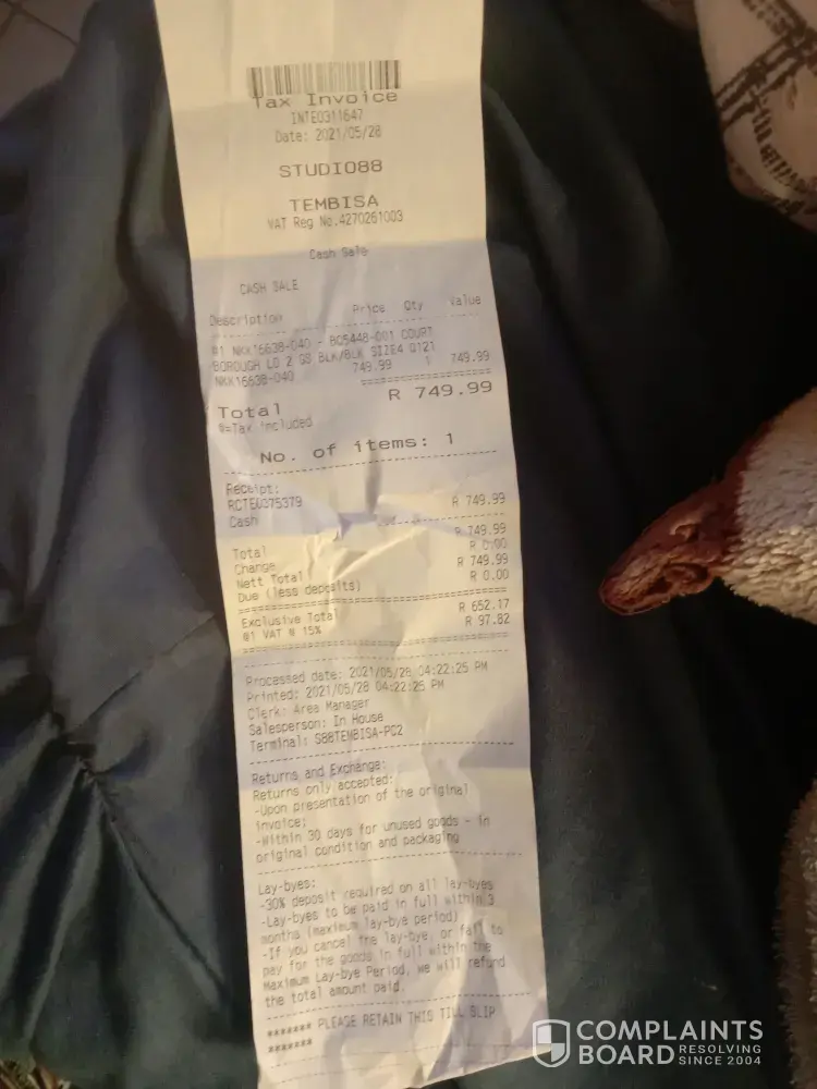 I bought a pair of Nike sneakers on the 28th of may at birch acres mall but I didnt have a size at that store so I volunteered to pay them and go fetch the correct size at tembisa plaza with original slip...i wore the sneakers the following day Yho but I regret with all my heart they looked like I have worn them for 2 years so I called Nike customer care to complain because I was unhappy so was my partner... I have bought Nike products in the past I have never experienced anything like this. Am really heart broken with the quality of the shoes now my partner thinks they sold me fake sneaker I can't wear them anymore.