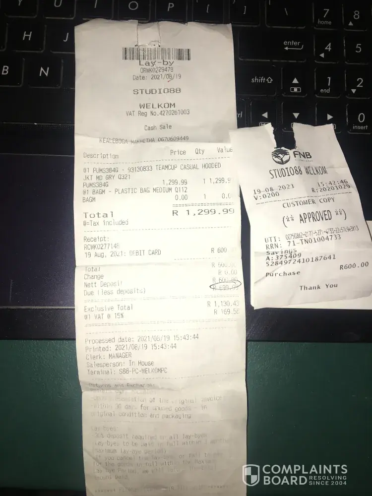 Am unhappy with the service I got at studio88 Ga-Rankuwa City the service there is very poor. I went there to cancel lay-bye and get a refund, the manager said I must bring proof from police since I don't have the slip, which I don't understand why coz this was not explained to me at first. And when I check the terms and conditions I do not see any written where it says "bring proof from police if you lost your slip". I had my ID with me. The manager was unprofessional and rude!