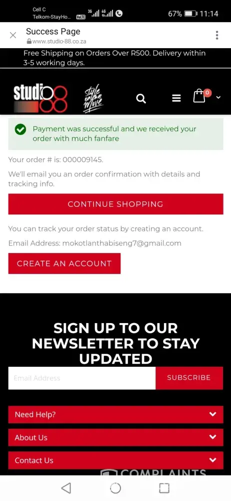 On the 16 October I made an online purchase (order) studio 88. I did not receive any confirmation from them until on the 18 October I decided to call them they said I must sent proof of payment to them I sent it via email. Till today I have any feedback from them whenever I call their office they cut my calls. Seems like they are used to scamming people
