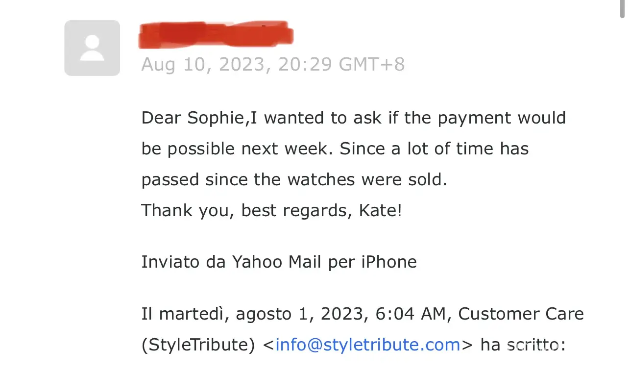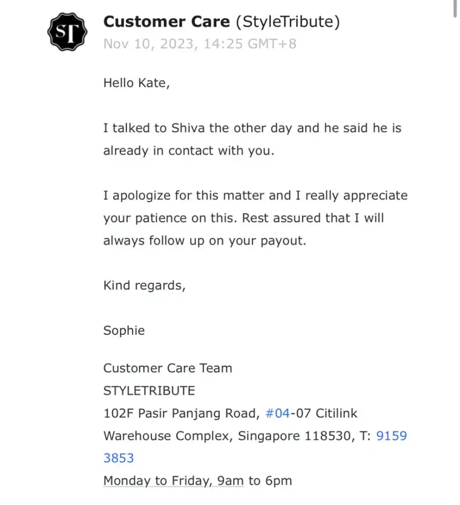 I have all the confirmation of my words in screenshots that I attached to this complaint. I also can provide the contact that I have with Style Tribute. My watches were sold 8 months ago and i haven’t seen any payment. They amount of money is 8000 SGD. They basically stole all the money from the sell of the watches. Sophie in the customer service and Shiva ( the owner) just keep promising to pay in 2 weeks each time I complain about the lack of payment, and it never happens. Once they even tried to make it seem that they sent me the money via bank transfer but it didn’t go through because it is an European bank account. Then I created a Singaporean bank account and they could not invent any excuses anymore so they just stopped answering at all. I am going to start a legal action against them soon. Now the only thing that Shiva writes to me is: Hi Kate. And then silence.