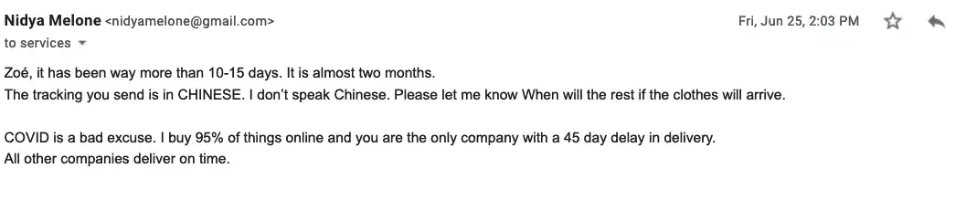 "Sorry that you are not satisfied with the item" the in bold letter the following sentence"PLEASE NOTE THAT CUSTOMERS MUST RESPOND TO EMAIL WITHIN 7 DAYS. IF NOT WE WILL CLOSE THIS CASE AFTER THE AFOREMENTIONED DEADLINE". They went on to say that their center is located in Guangzhou, China and that as a customer I am responsible for all shipping cost and other return related charges inclusive of custom fee and that my refund will only be issued after recept and inspection of package. However this was the kicker "SINCE INTERNATIONAL RETURNS MIGHT RESULT IN LONG WAITING TIMES AND INCUR SUBSTANSTIAL COST ON MY SIDE, WE RECOMMEND SOME ALTERNATIVE METHODS TO RESOLVE THE ISSUE. WE WOULD LIKE TO OFFER YOU A 15% CASH REFUND INSTEAD OF RETURNING THE ITEMS. iF THERE ARE ANY SIZING ISSUES YOU CAN USE YOUR REFUND TO ALTER THE CLOTH". If I still wanted to return the package I should email them for a return label within 7 days of the aforementioned deadline.